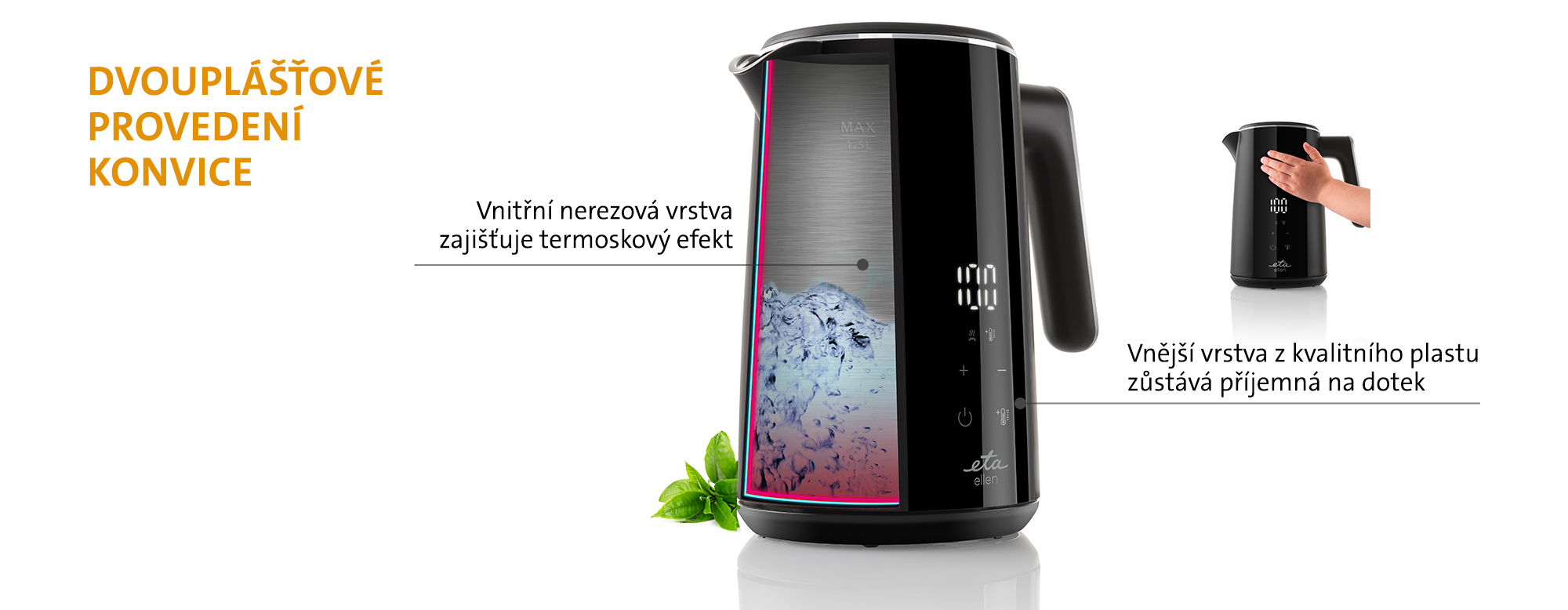 Dvouplášťové provedení rychlovarné konvice ETA Ellen zabrání nechtěnému popálení. Její vnější vrstva z kvalitního plastu totiž zůstává stále příjemná na dotek, a to i přesto, že to uvnitř pořádně vře. Vnitřní část konvice je vyrobena z nerezu, který je odolný a hygienický.