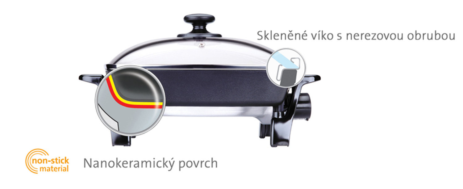 Speciální antiadhezivní vrstva NANO CERAMIC zabraňuje přichytávání připravovaných pokrmů, pánev tak umožňuje přípravu jídel naprosto bez tuku. Nepřilnavý povrch zároveň usnadňuje čištění. Zesílené dno pak zajistí rovnoměrné rozvedení tepla po celé ploše pánve.