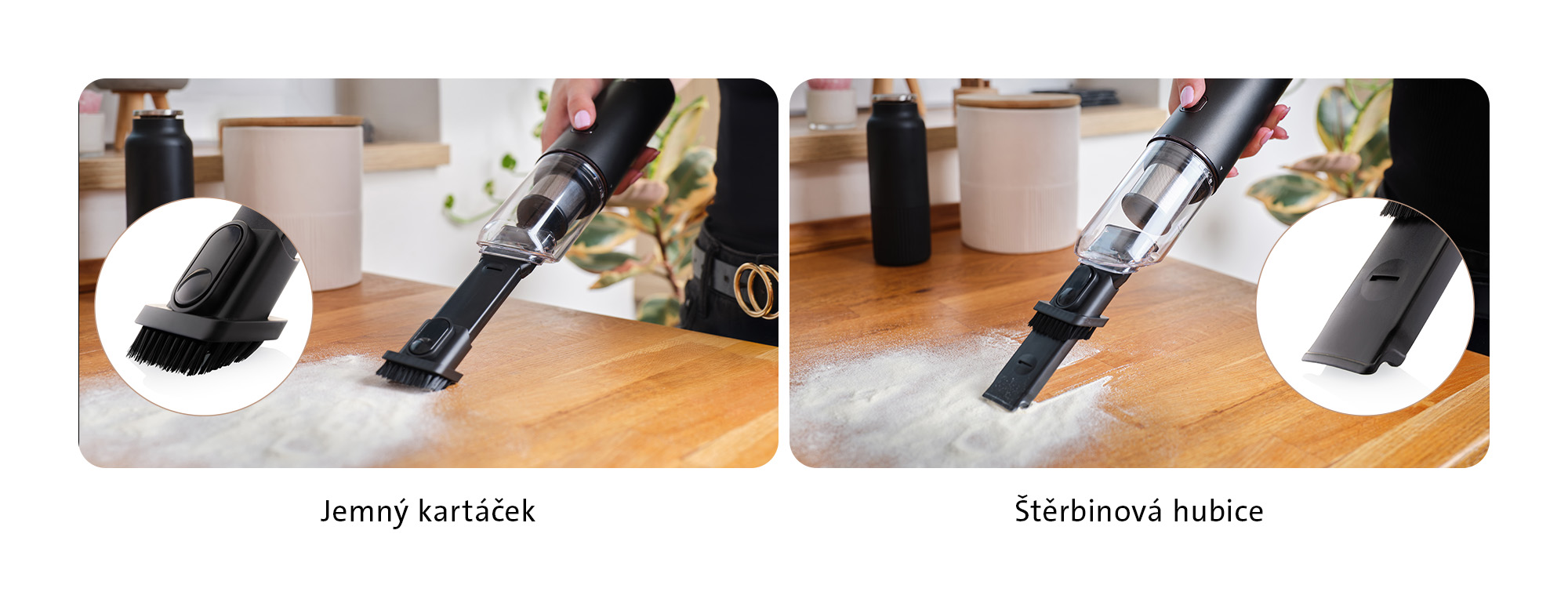 Součástí balení je nástavec 2 v 1, který kombinuje jemný kartáček a štěrbinovou hubici. Kartáček oceníte při šetrném úklidu nábytku, obrazů nebo parapetů, zatímco štěrbinová hubice se dostane do úzkých prostor – například mezi žebra radiátorů, za nábytek či do interiéru auta.