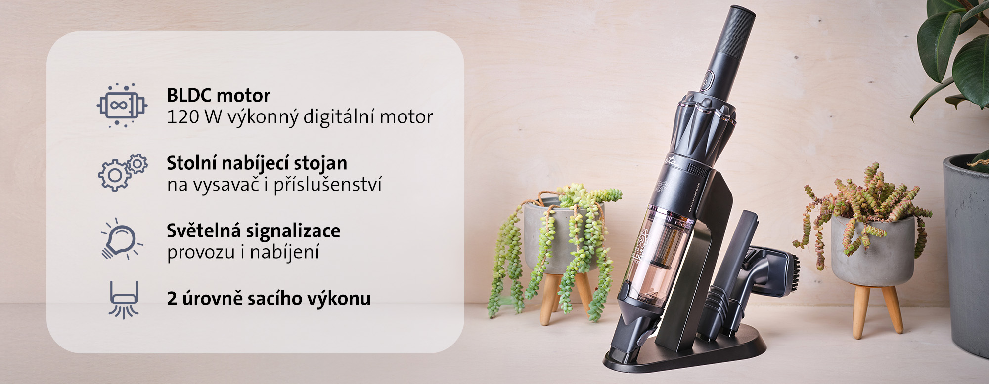 Srdcem tohoto ručního vysavače je výkonný digitální BLDC motor nové generace o síle 120 W – nejvýkonnější v celé řadě HANDY. Poskytuje silný sací výkon a zároveň se vyznačuje dlouhou životností. Díky dvěma úrovním sání si snadno přizpůsobíte výkon aktuální situaci – od jemného úklidu po důkladné vysávání. O napájení se stará moderní Li-Ion akumulátor (14,4 V, 2600 mAh), který zajistí až 35 minut provozu na jedno nabití. Po úklidu stačí vysavač jednoduše odložit do stylového stolního stojánku, který slouží zároveň jako nabíječka i praktické místo pro uložení příslušenství.