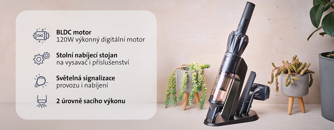 Ruční vysavač se stojanem kombinuje extra silný 120W digitální BLDC motor, extrémně nízkou hmotnost pouhých 0,5 kg a výdrž baterie až 35 minut – nejvíce v celé řadě HANDY. Díky dvoustupňovému nastavení sání, kompaktním rozměrům, HEPA filtru s nerezovým předfiltrem a praktickému příslušenství včetně štěrbinové a polštářové hubice je ideálním pomocníkem pro rychlý a efektivní úklid domácnosti i auta. Nabíjecí stojan navíc slouží i jako praktické odkládací místo.