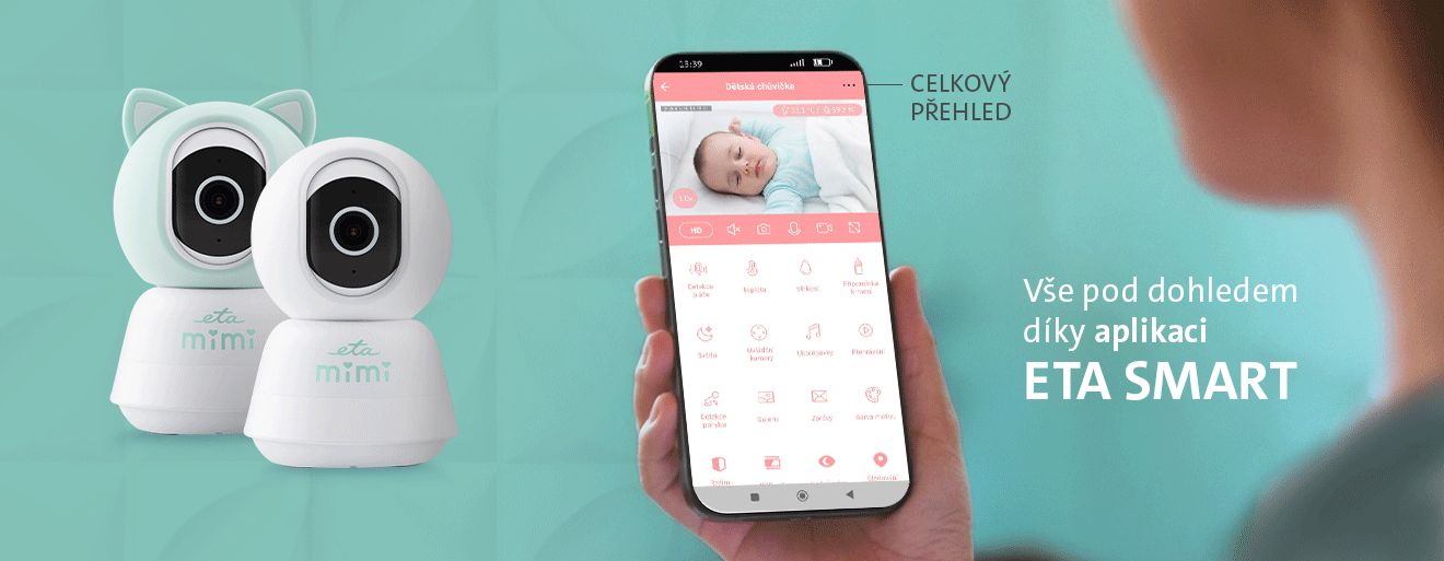 Aplikace ETA Smart vám umožní mít své dítě pod dohledem kdykoliv a odkudkoliv. Stačí chůvičku připojit k Wi-Fi (2,4 GHz) a spárovat ji s telefonem nebo tabletem. V aplikaci pak v reálném čase sledujete obraz, přehráváte záznamy a nastavujete upozornění. Přístup lze sdílet až pro 4 účty, takže maminka, tatínek i prarodiče mohou sledovat přenos současně.