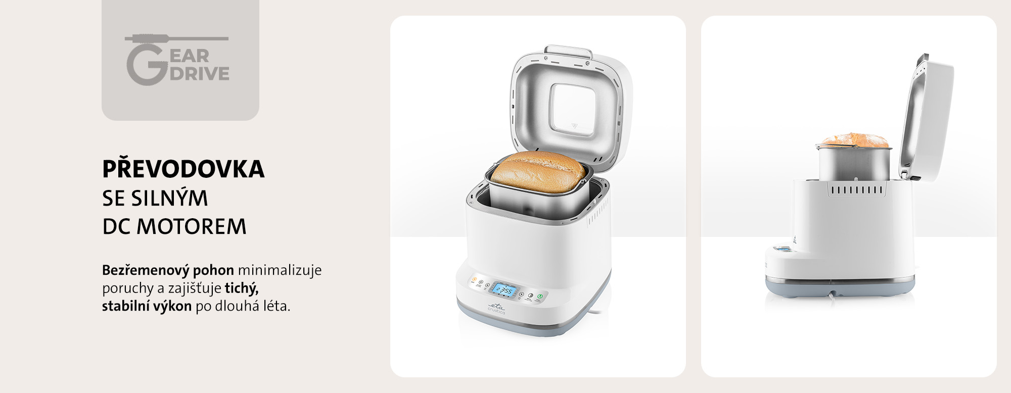 Základem této pekárny je bezřemenový GearDrive systém – robustní převodovka spojená se silným DC motorem. Oproti tradičním modelům zde není žádný řemen, který by se mohl poškodit nebo přetrhnout. Tento technický detail znamená vyšší spolehlivost, delší životnost a méně starostí pro vás.
