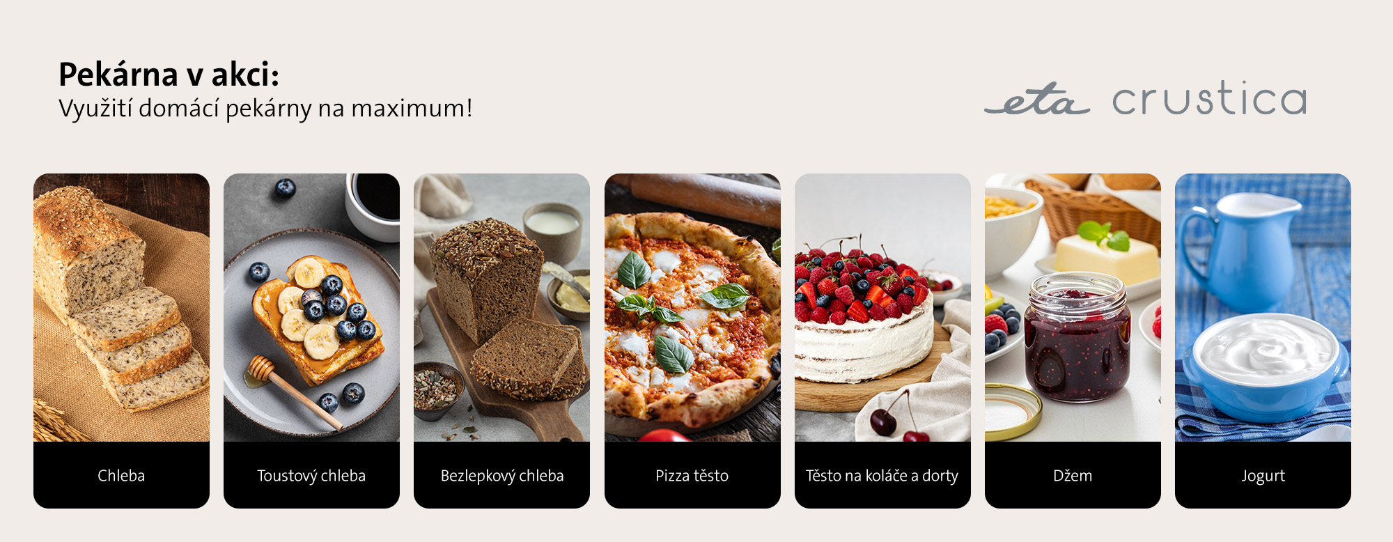 Chcete si upéct vlastní chléb, který bude přesně podle vašich představ? S domácí pekárnou ETA Crustica je to jednodušší než kdy dřív. Do pekárny stačí přidat suroviny, nastavit si jeden z 12 programů a o zbytek se automaticky postará sama. Pekárna je vybavena unikátní bezúdržbovou převodovkou, která zajišťuje tichý chod a dlouhou životnost.