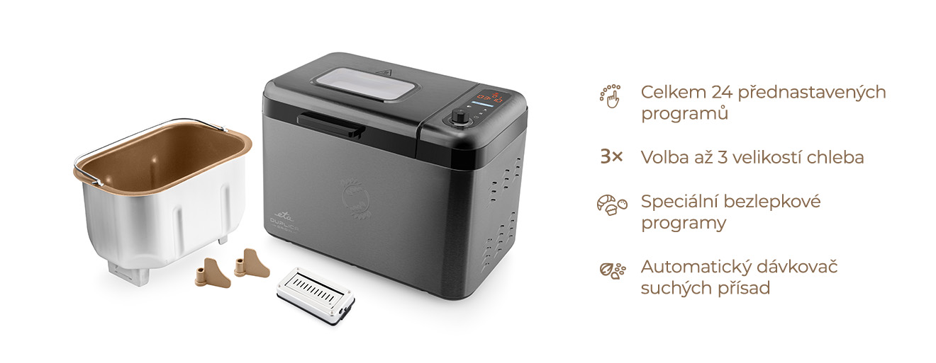 Probuďte se do vůně čerstvě upečeného chleba s domácí pekárnou ETA Duplica II Origin, která vám nabídne až 24 přednastavených programů, včetně programů pro různé druhy chleba, bezlepkového pečiva, jogurty, těsta na pizzu nebo kynutý knedlík. Pusťte se do domácího pečení a ke kupovanému pečivu už se nebudete chtít vracet.