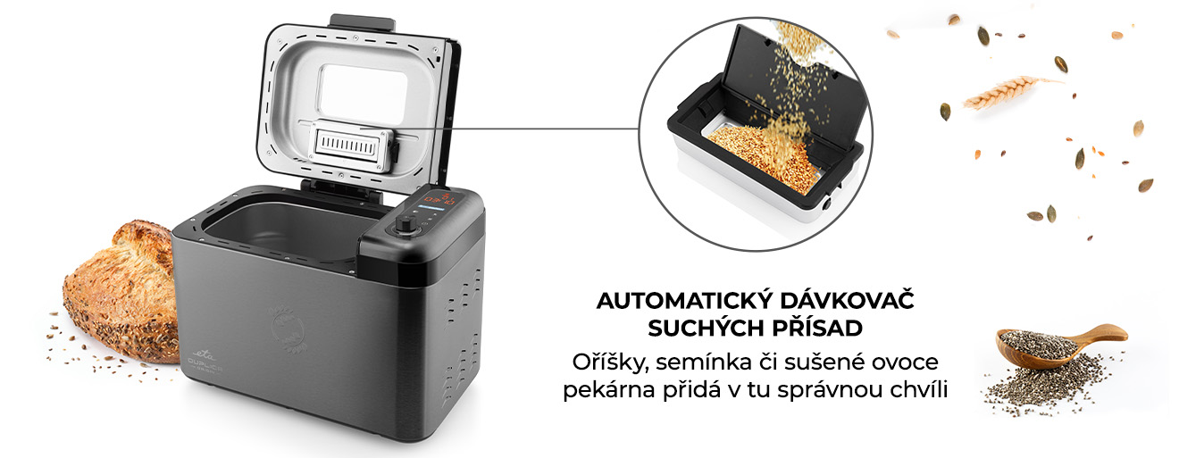 Na domácí pekárnu ETA Duplica II Origin se můžete vždy plně spolehnout. Automaticky přidá suché oříšky, semínka či sušené ovoce, v přesně stanovený okamžik – vy se tak nemusíte o nic starat a přísady nebudou nadměrně rozdrceny, což zaručuje jejich dokonalou texturu a chuť.