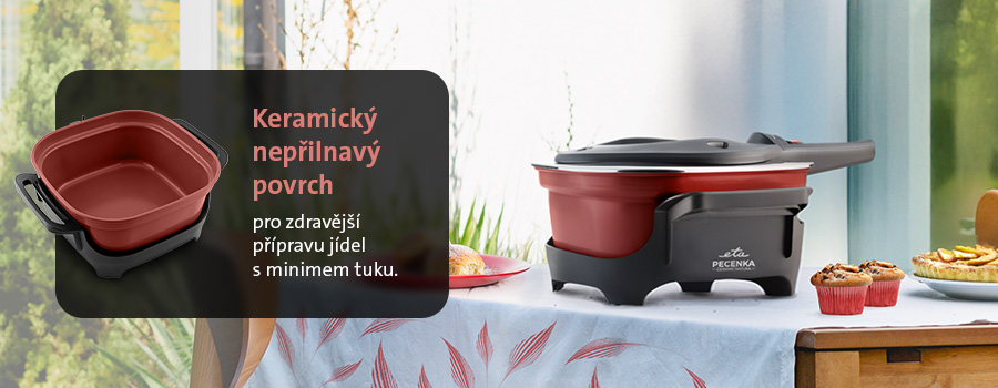 ETA Pečenka přichází v novém, zdravějším kabátě – s pečicí nádobou s nepřilnavým keramickým povrchem. Pečení je úsporné a chutné, ale i šetrnější ke zdraví. Zachovává si současně všechny oblíbené přednosti Pečenky – rychlý ohřev, rovnoměrné pečení a nízkou spotřebu energie. Zvládne vaření, dušení, zapékání i sladké dezerty.
