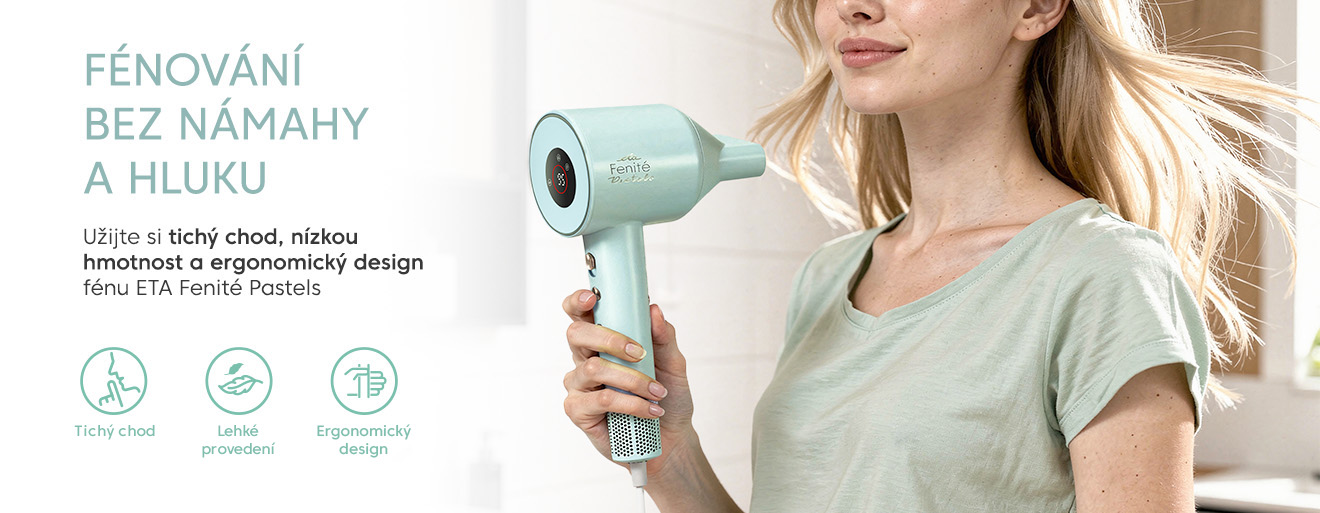 Lehké provedení, ergonomická rukojeť a 2metrový kabel zajišťují pohodlnou manipulaci i při delším používání. Nastavení rychlosti a teploty přehledně zobrazí LED displej. Údržba je velmi jednoduchá – odnímatelná zadní mřížka brání vnikání vlasů a nečistot do motoru. Fén ETA Fenité Pastels spojuje výkon, moderní technologie a komfortní používání v elegantním provedení.