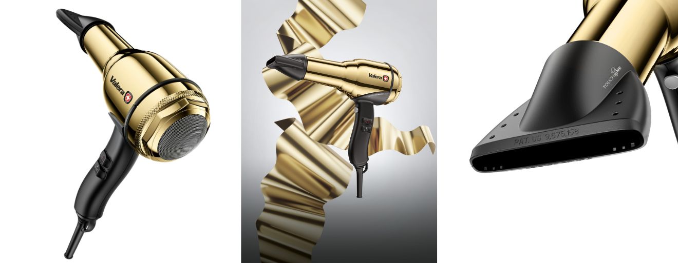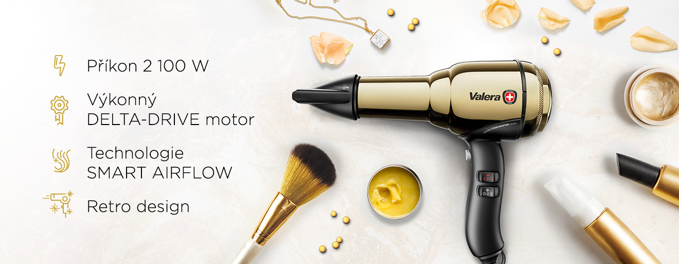 Luxusní fén na vlasy v retro designu švýcarské značky Valera je pozlacený pravým 24karátovým zlatem. Nabízí nadstandardní výbavu uloženou v prémiovém těle z chromované ušlechtilé oceli, která zůstává chladná i při maximální teplotě. Fén pohání mimořádně spolehlivý DELTA DRIVE motor s příkonem 2 100 W.