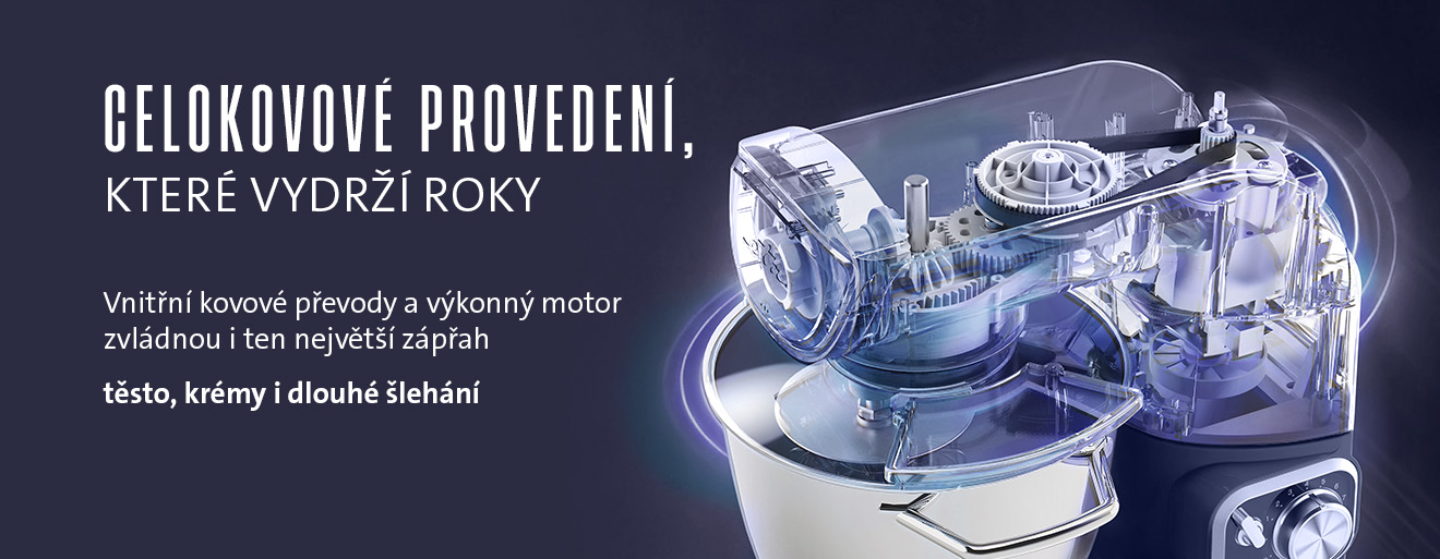 Silný motor s příkonem až 1500 W, odolné celokovové provedení včetně kovových převodových kol jsou zárukou vysoké odolnosti, dlouhé životnosti a perfektní stability i při velké zátěži. Díky plynulé regulaci otáček si přizpůsobíte intenzitu míchání podle konkrétního receptu. Nechybí funkce PULSE pro maximální výkon ani stabilizátor otáček, který zajistí stálý výkon i při náročnějším zpracování. Planetární systém míchání zase zaručuje dokonalé promísení všech ingrediencí v prostorné nerezové míse o objemu 5,5 litru.