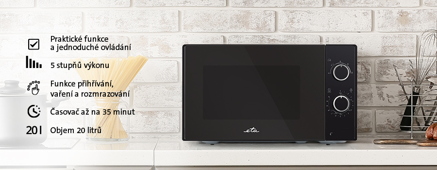 Ovládání je čistě mechanické – jednoduché a funkční. K dispozici jsou funkce přihřívání, vaření a rozmrazování, přičemž časovač až na 35 minut vám umožní zvolit ideální dobu ohřevu. Bezpečnostní prvek v podobě automatického vypnutí při otevření dvířek a integrované osvětlení vnitřního prostoru zvyšují komfort používání. O konci ohřevu vás informuje zvuková signalizace.