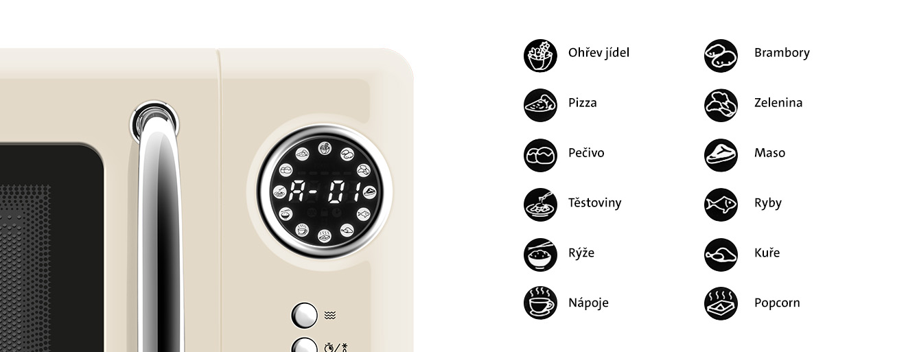 Ovládání mikrovlnné trouby ETA Storio je intuitivní a pohodlné díky přehlednému LED displeji a otočnému ovládání pro snadné nastavení programu. Displej v době nečinnosti poslouží jako praktické hodiny, k dispozici je také časovač až na 60 minut a funkce odloženého startu. O dokončení programu vás informuje zvukový signál, a díky osvětlenému vnitřnímu prostoru máte průběh přípravy jídla stále pod kontrolou. Otočný talíř s průměrem 24,5 cm zajistí rovnoměrné ohřátí pokrmů, takže si každé jídlo vychutnáte přesně tak, jak má být.