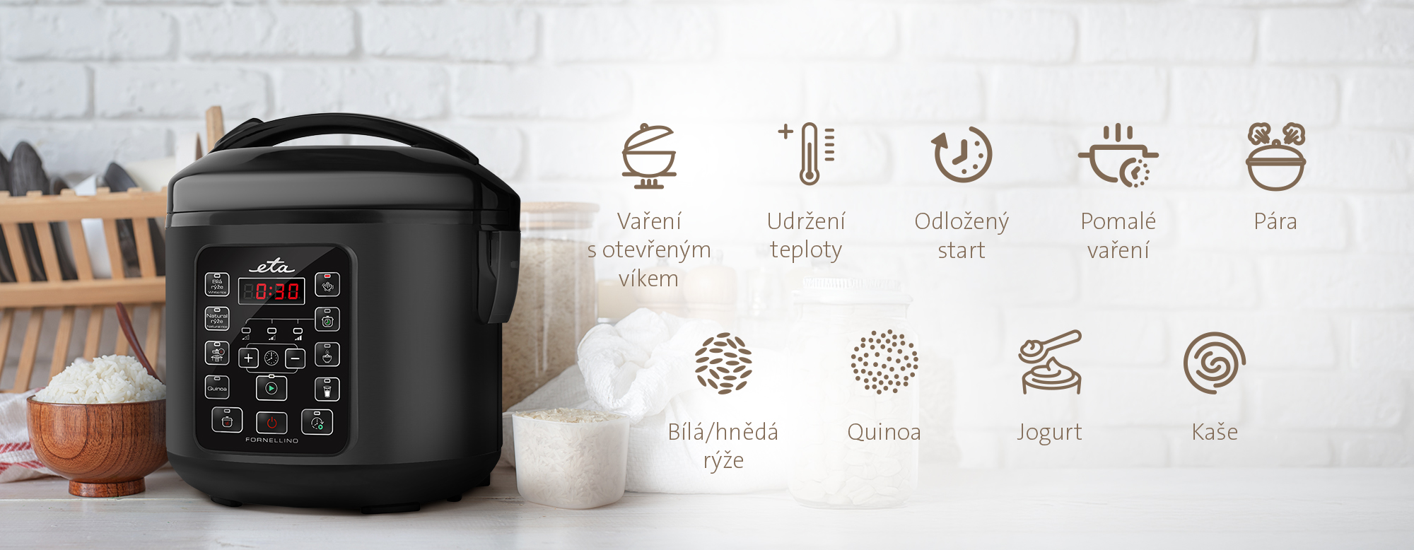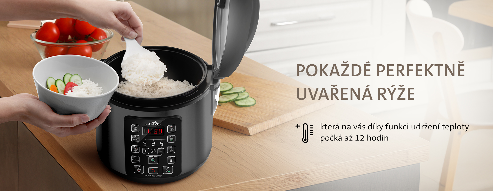 Vaření rýže nikdy nebylo tak snadné. S multifunkčním rýžovarem ETA Fornellino budete mít perfektně uvařenou rýži už pokaždé, navíc téměř bez práce. ETA Fornellino se o vše postará sám, a to díky zcela automatickému provozu. Po dovaření navíc udržuje teplotu, a to až 12 hodin.