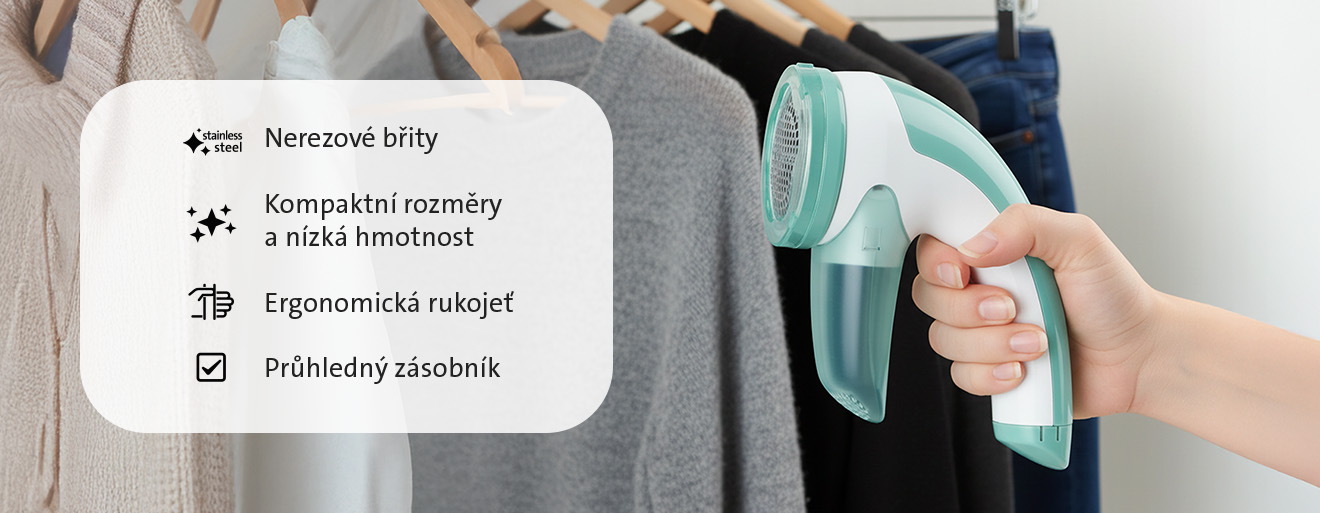 Odstraňovač je vybaven ostrými břity a 45mm pracovní plochou, která efektivně zbaví všechny druhy textilií nechtěných nedostatků. Díky možnosti nastavení vzdálenosti planžety od látky si přístroj snadno poradí s jemnými i hrubšími materiály – od svetrů až po čalounění. Průhledný zásobník umožňuje snadnou kontrolu naplnění a jeho odnímatelná konstrukce zajišťuje rychlé vysypání.