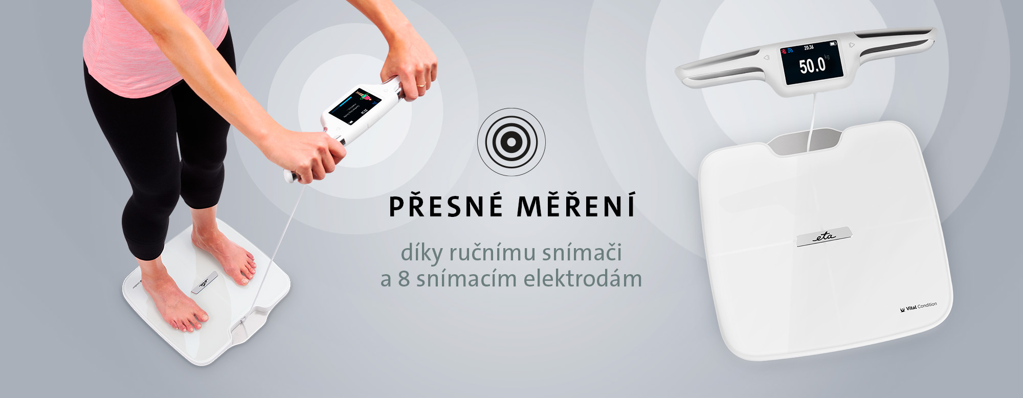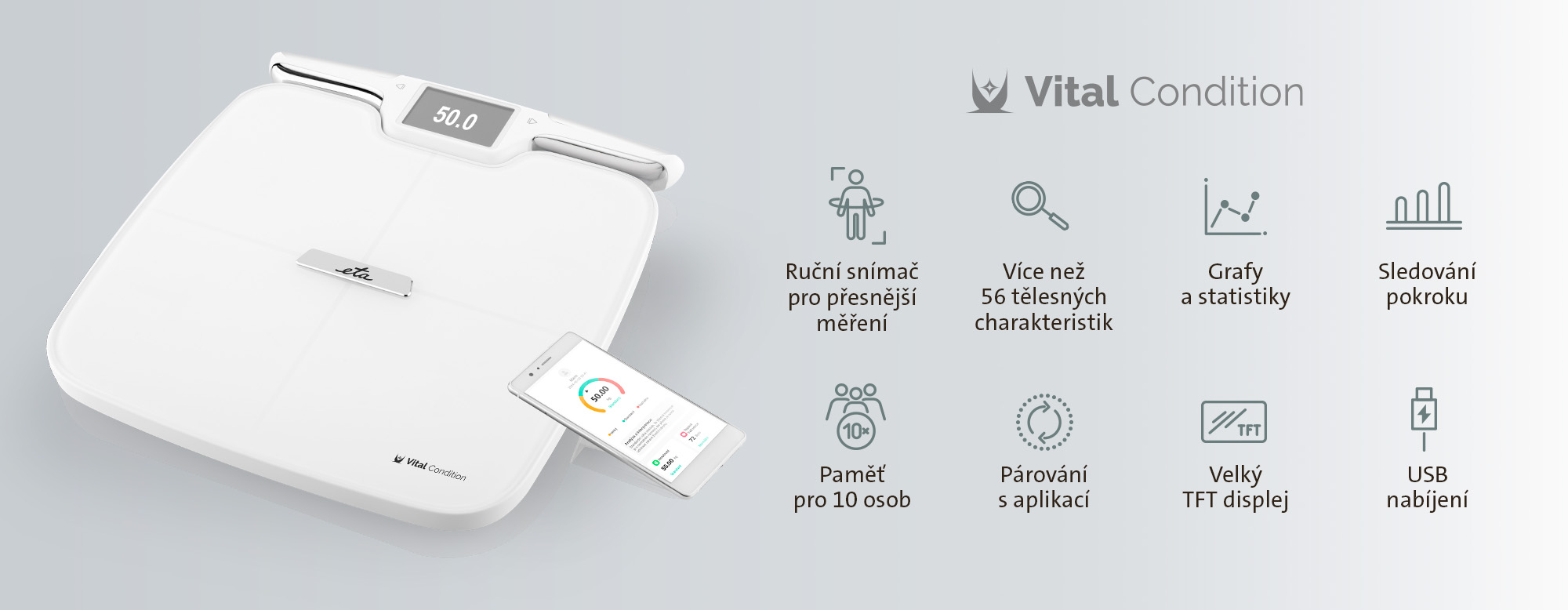 Analytická osobní váha ETA Vital Condition vám pomůže lépe porozumět vlastnímu tělu. V kombinaci s chytrou aplikací ETA Body Balance v mobilním telefonu nebo tabletu dokáže vyhodnocovat více než 56 tělesných charakteristik a dlouhodobě ukládat jejich vývoj – od hmotnosti, podílu tuku a vody v těle, přes svalovou hmotu až po detailní analýzu jednotlivých částí těla. Díky tomu snadno odhalíte změny, které by vám běžná váha nikdy neukázala.