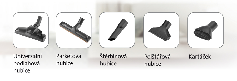 V balení naleznete tyto hubice pro použití na různých druzích podlahových povrchů: