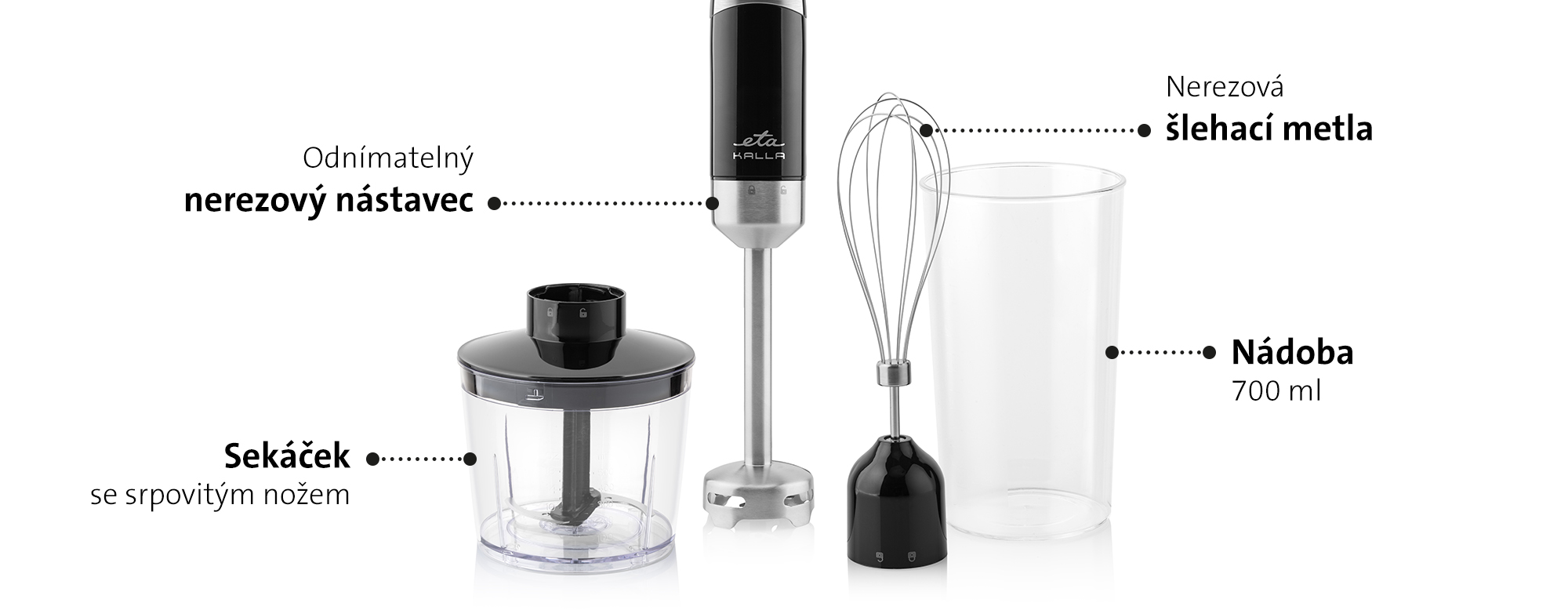 Tyčový mixér s příslušenstvím ETA Kalla vám bude po ruce klidně každý den. Vyniká nejen v mixování, ale připraví i krémové omáčky, polévky, dipy, smoothie a poradí si i se šleháním šlehačky a sněhu.