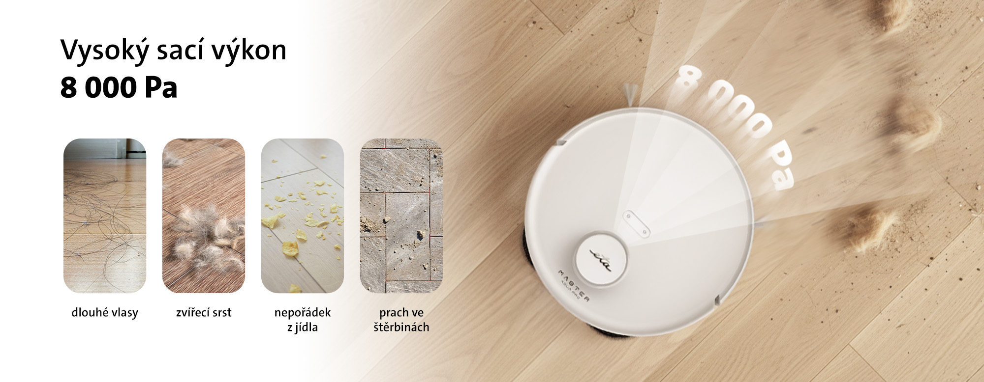 Výkonný digitální motor s extra dlouhou životností nabízí mimořádný sací výkon až 8000 Pa, a hravě si poradí i s hluboko usazeným prachem v kobercích. Kombinace vysoce účinného vysávání a mopování snižuje prašnost, což může být vhodné pro domácnosti s alergiky i domácími mazlíčky. Li-Ion akumulátor (14,4 V / 5200 mAh) zajistí až 240 minut nepřetržitého provozu na jedno nabití. Poté se vysavač automaticky vrátí do stanice, kde se zcela dobije přibližně za 6 hodin a naváže na úklid tam, kde skončil.