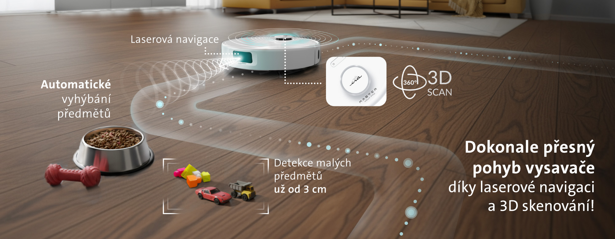 Robotický vysavač se pohybuje s maximální přesností díky pokročilé laserové navigaci, která dokáže v reálném čase zmapovat celý prostor v rozsahu 360°. Díky funkci QUICK MAP vytvoří podrobný plán domácnosti během několika minut, aniž by během tohoto procesu uklízel. Zvládne uložit až 5 samostatných map.