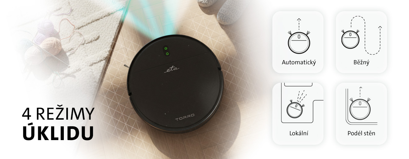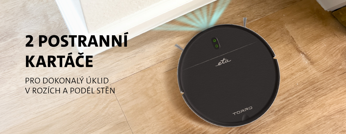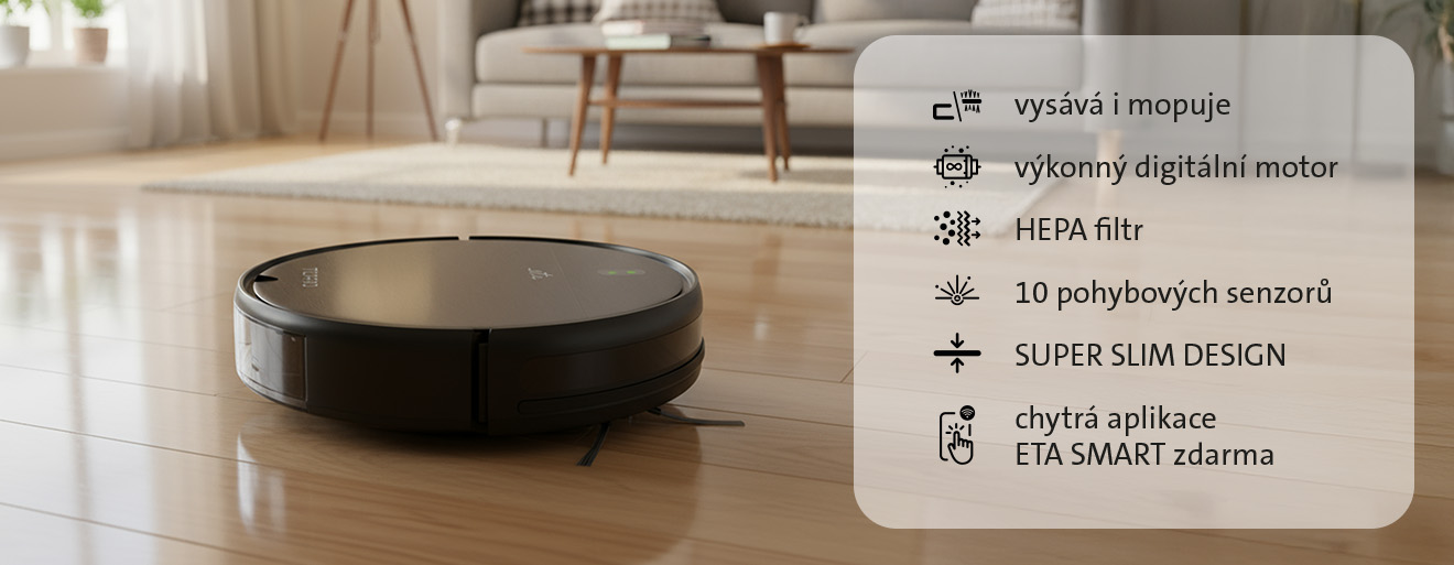Nechte každodenní úklid na jiných. Robotický vysavač ETA Torro u vás vysaje i setře jemný prach a vše mu jednoduše nastavíte ze svého mobilního telefonu. Úkoly mu můžete rozdávat i na dálku a úklid si naplánujete klidně i pravidelně na různé dny a hodiny.