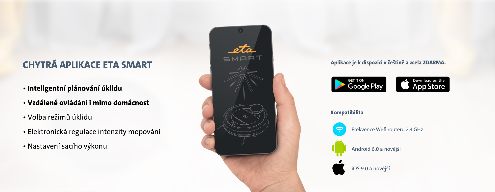 Díky chytré aplikaci rozdáte vysavači úkoly z gauče, koupelny nebo z práce. Chcete mít uklizeno pokaždé když přijdete domů? Úklid si můžete naplánovat klidně na konkrétní den a čas. Aplikace ETA SMART vám zkrátka umožní pohodlné ovládání vysavače odkudkoliv.