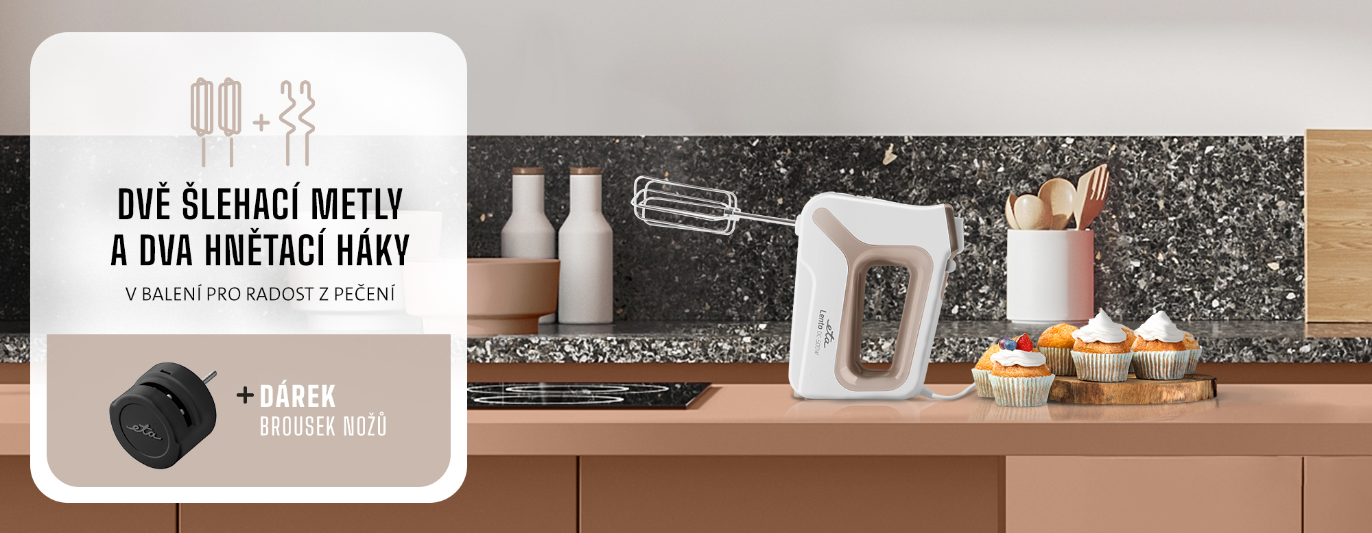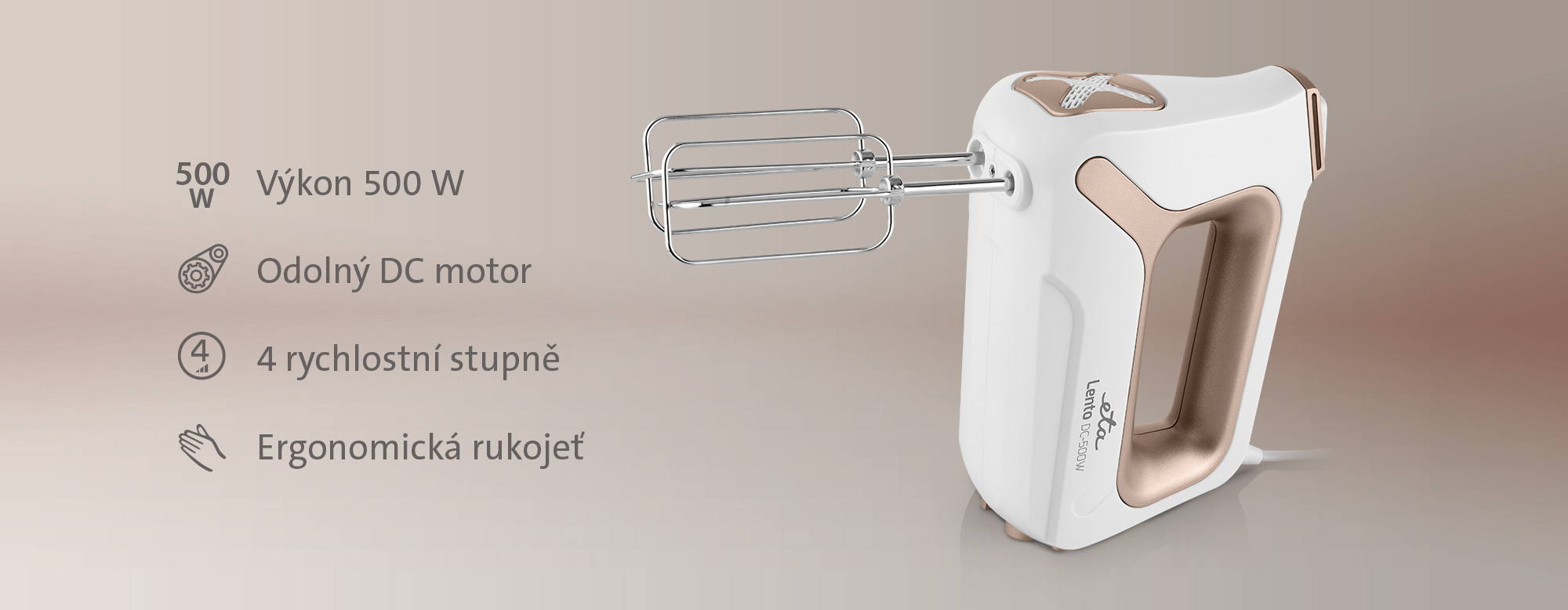 Lehká konstrukce a ergonomicky tvarované držadlo zajišťují pohodlné ovládání i při delším použití. Takže ať už šleháte smetanu na šlehačku, bílky na sníh, lívancové těsto nebo třeba bramborovou kaši, s ETA Lento je vše hračka.