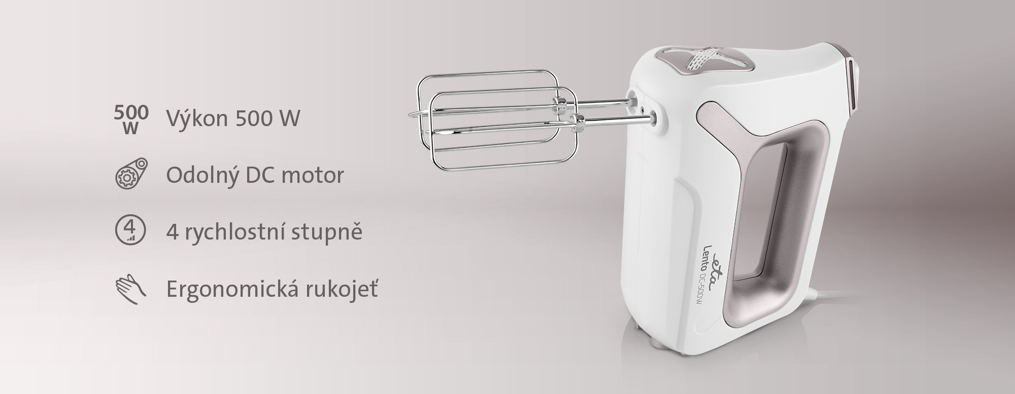 Lehká konstrukce a ergonomicky tvarované držadlo zajišťují pohodlné ovládání i při delším použití. Takže ať už šleháte smetanu na šlehačku, bílky na sníh, lívancové těsto nebo třeba bramborovou kaši, s ETA Lento je vše hračka.