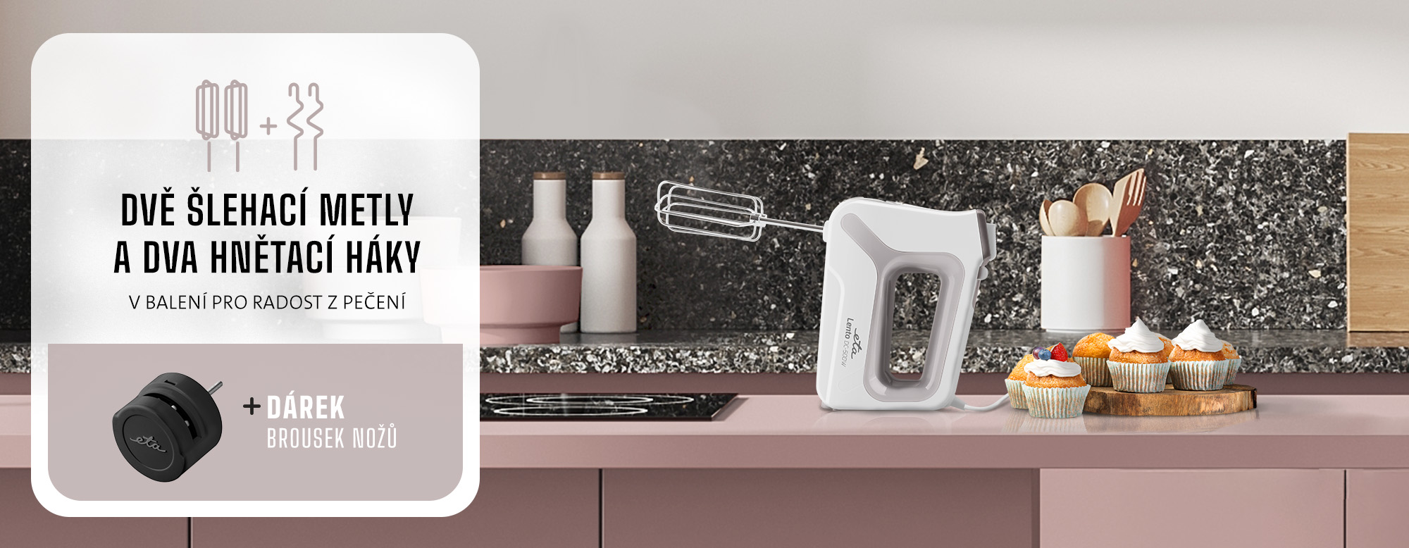 V balení najdete dvě dlouhé šlehací metly a dva hnětací háky, které snadno nasadíte i vyjmete pomocí praktického tlačítka. Jako dárek v balení najdete brousek na nože, který vrátí dokonalé ostří i starším nožům. Pro ještě větší všestrannost si můžete dokoupit i odnímatelný nerezový tyčový mixér ETA105100040, se kterým připravíte polévky, omáčky, mléčné koktejly nebo přesnídávky raz dva.