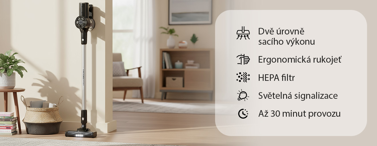 Tyčový vysavač ETA Nexo je vybaven digitálním motorem s vysokou účinností a dlouhou životností. Dvě úrovně sacího výkonu vám umožní přizpůsobit sílu vysávání podle potřeby – od každodenního úklidu po důkladné vysávání náročnějších povrchů. HEPA filtr zachytí i ty nejmenší prachové částice, takže je skvělou volbou i pro alergiky.