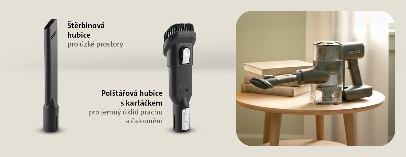 S rotačním turbokartáčem, který má přímý pohon a flexibilní kloub, je vysávání koberců i tvrdých podlah (parkety, dlažba, linoleum) efektivní a zároveň šetrné. Štěrbinová hubice se dostane do úzkých míst, zatímco kartáček a polštářová hubice 2 v 1 zajistí jemné čištění prachu a čalouněného nábytku. Součástí balení vysavače ETA Nexo je i praktický plastový úchyt na zeď, takže vysavač máte vždy po ruce.