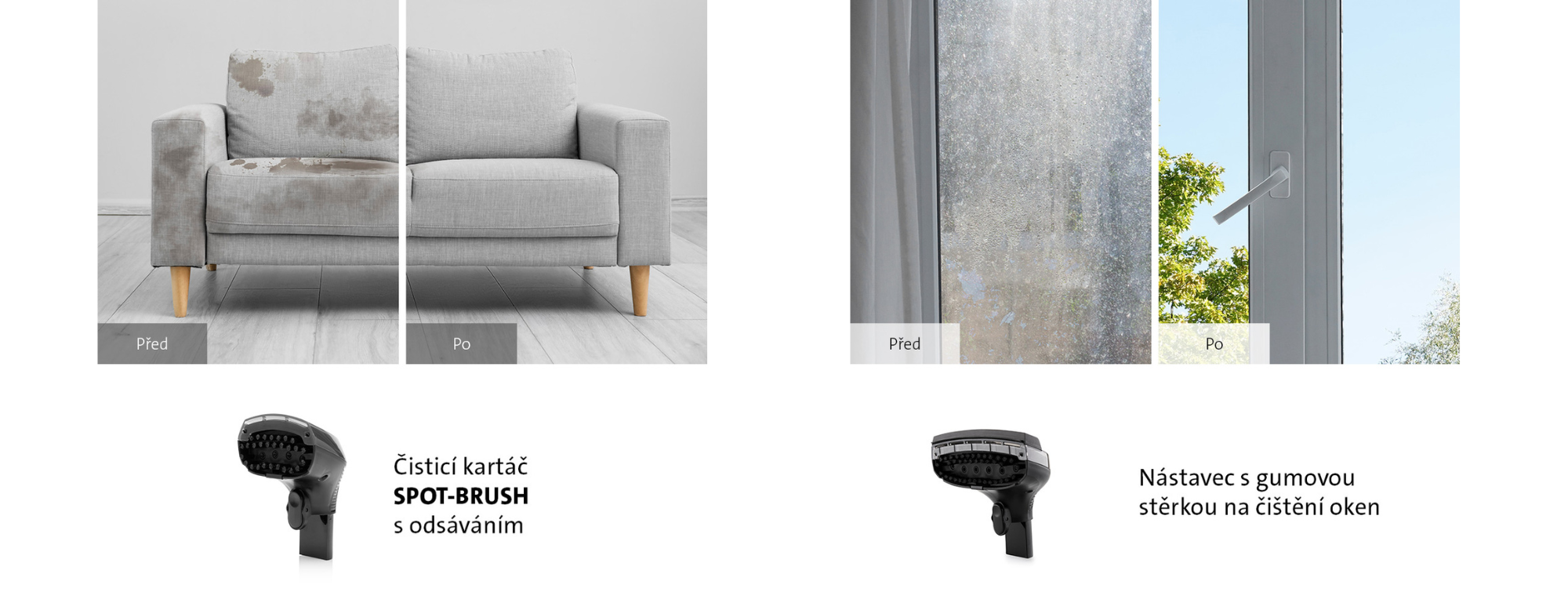 Pro větší plochy je tu široký čisticí nástavec SPOT-BRUSH, který je ideální na větší čalouněné plochy a koberce, které vyžadují důkladné čištění. S nasazenou krytkou s integrovanou gumovou stěrkou a funkcí odsávání špinavé vody je navíc skvělý i na okna, sprchové kouty a další hladké povrchy.