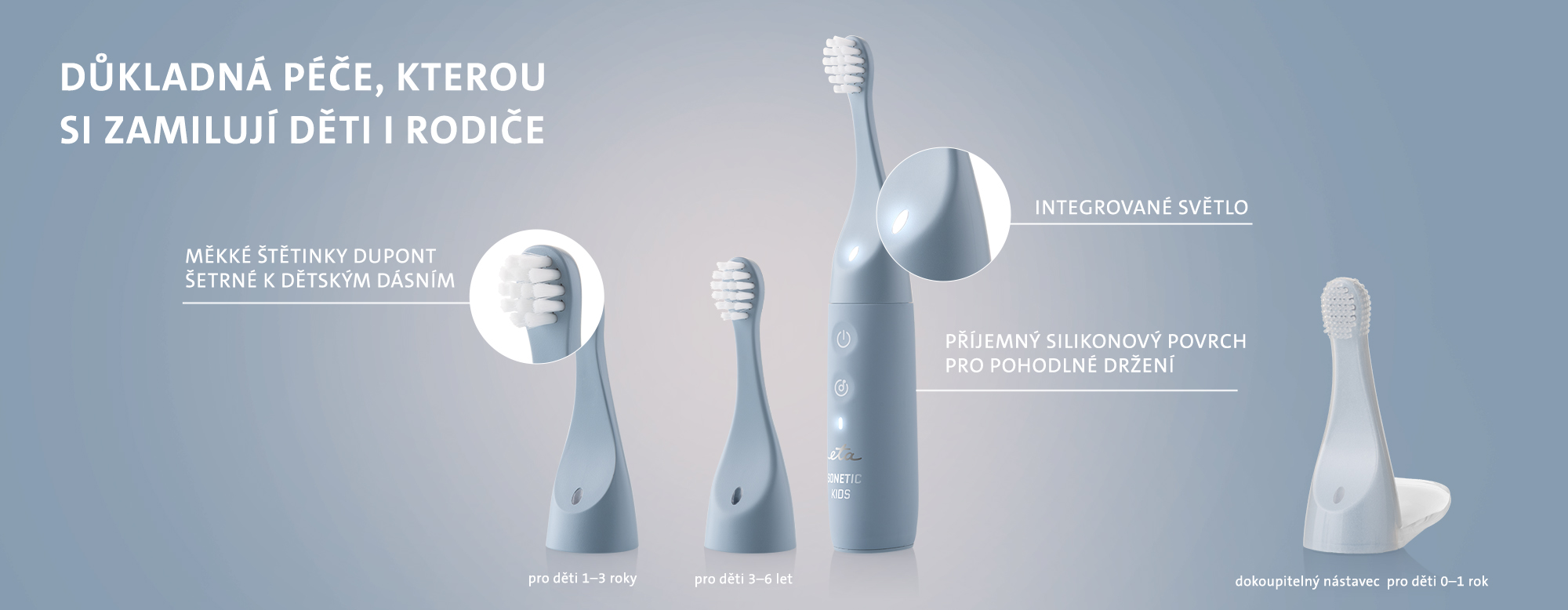 Dětský sonický kartáček ETA kombinuje sonickou technologii MOVE+ s až 18 000 pohyby za minutu, aby vaše dítě mělo zoubky a dásně důkladně, ale šetrně vyčištěné. Měkké štětinky DuPont a šikmá hlavice zajišťují perfektní přístup i do těžko dosažitelných míst, aniž by docházelo k podráždění.