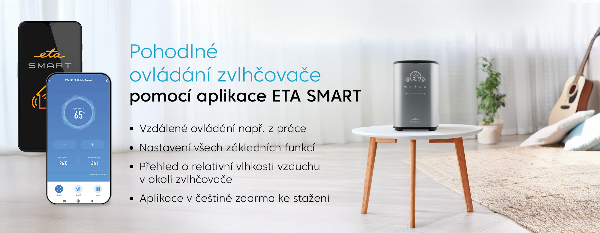 Zvlhčovač ETA můžete ovládat přesně tak, jak vám to vyhovuje. K dispozici máte přehledné dotykové ovládání přímo na přístroji, které umožňuje snadný a intuitivní přístup ke všem funkcím. Pokud dáváte přednost pohodlí, oceníte praktické dálkové ovládání, díky němuž můžete měnit nastavení, aniž byste museli vstávat z pohovky. Ještě více možností pak přináší chytrá aplikace ETA SMART, dostupná zdarma v češtině. Pomocí Wi-Fi připojení zvlhčovače umožňuje vzdálené ovládání odkudkoliv – třeba z práce. Snadno tak zapnete či vypnete přístroj, naplánujete jeho provoz nebo nastavíte časovač v rozmezí 1–24 hodin. Aplikace zároveň poskytuje přehled o aktuální vlhkosti vzduchu a teplotě, takže máte o kvalitě vzduchu ve svém domově neustálý přehled.