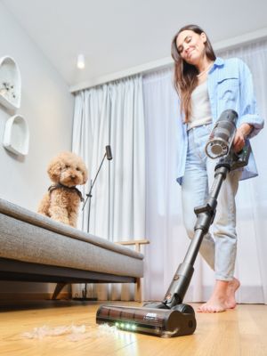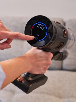 Tyčový vysavač je vybaven dotykovým OLED displejem, který vás bude v průběhu vysávání informovat o aktuálním sacím výkonu a stavu baterie. A pokud budete chtít mít úklid plně ve vlastních rukou, na displeji můžete manuálně upravit výkon podle vlastních potřeb. Bílé LED diody na hubici vždy posvítí na vysávanou plochu, takže vám navíc neunikne žádné smítko. A až budete mít hotovo, stačí jediný stisk tlačítka a 0,5l nádoba na nečistoty se vyprázdní bez toho, aniž byste si ušpinili ruce. Pro maximální hygienu a pohodlí.