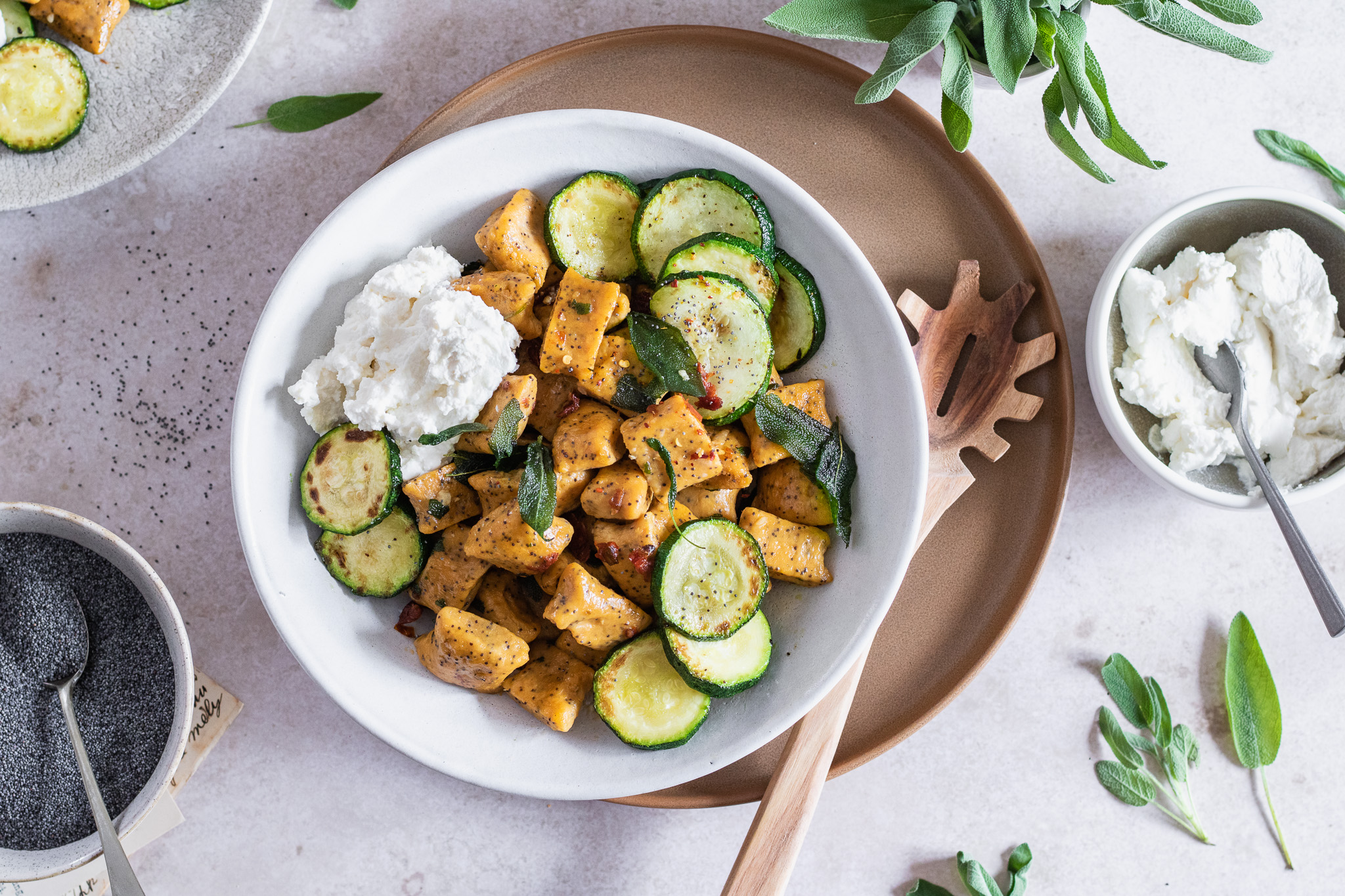 Kombinace nasládlých batátů ve spojení s lahodnou a svěží ricottou chutná báječně. Proto se přímo nabízí ricottu s noky nejen podávat, ale také trochu přimíchat do těsta. A nezapomeňte na mák, který krásně a jemně křupe mezi zuby.