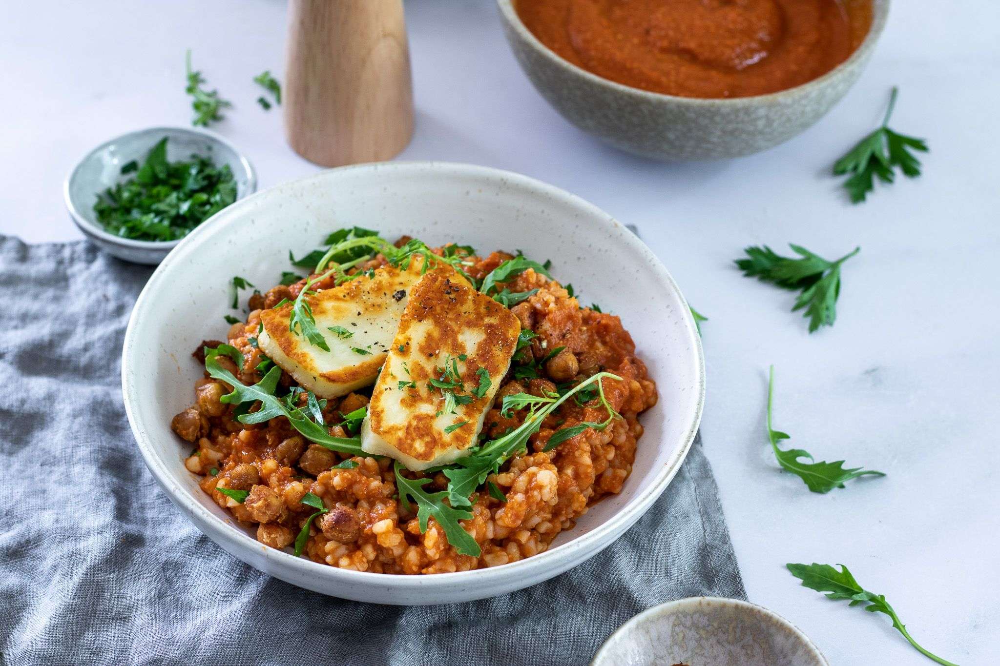 6. Halloumi nakrájejte na plátky. Pánev lehce potřete olejem a halloumi z obou stran opečte dozlatova. Podávejte s bulgurem. Posypejte rukolou a bylinkami.