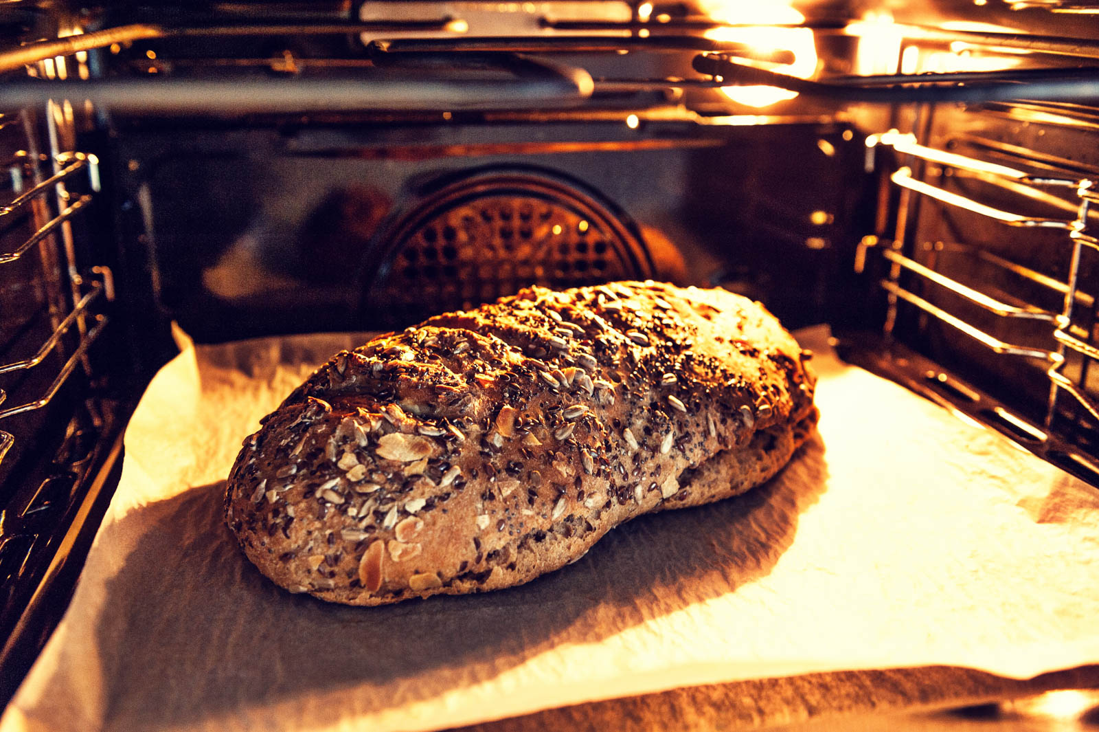 5. Z vykynutého těsta vytvarujte bochník, položte ho na plech vyložený pečicím papírem a posypte oblíbenými semínky. Na povrchu ho mírně nařízněte do kříže a nechte ještě 30 minut dokynout. Troubu předehřejte na 220 °C.