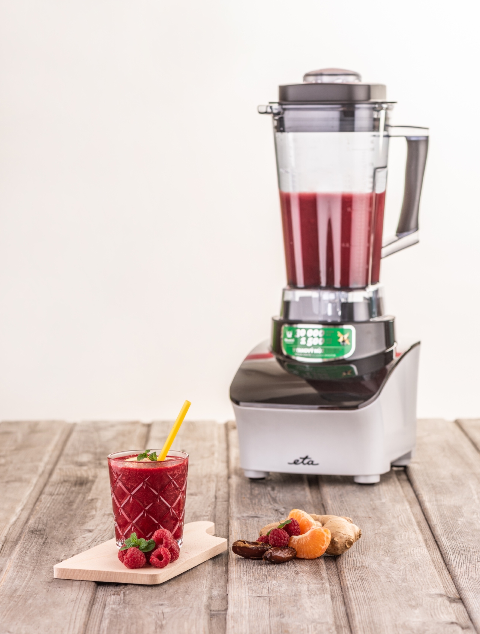 - Červenou řepu oloupejte. Abyste si nezabarvili ruce, použijte silikonové rukavice. Řepu není potřeba krájet nadrobno, stolní mixér Vital Blend zvládne rozmixovat i větší kousky. Dejte ji společně s oloupanou mandarinkou, citronem a omytými malinami do mixéru. Přidejte 8 datlí bez pecek a oloupaný zázvor.
