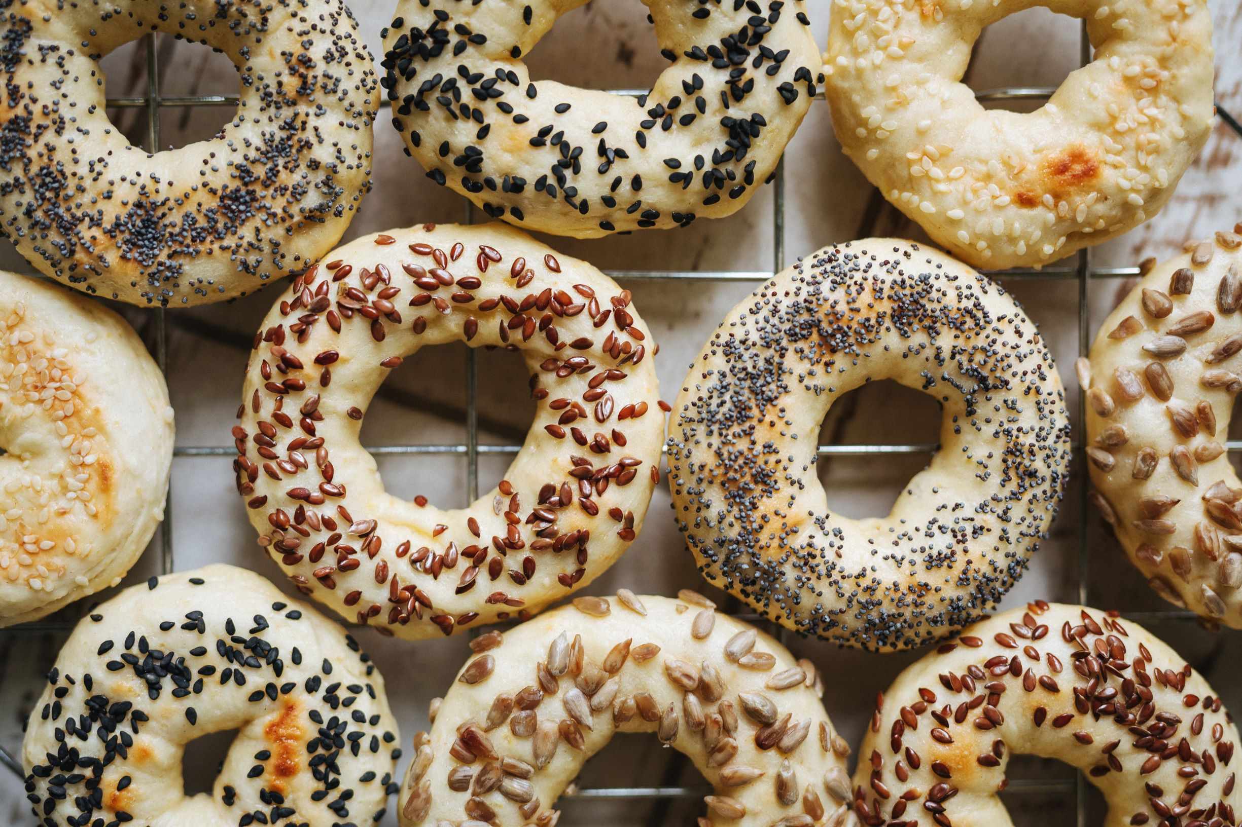 3. Bagely pomažte rozšlehaným vejcem a posypte semínky.