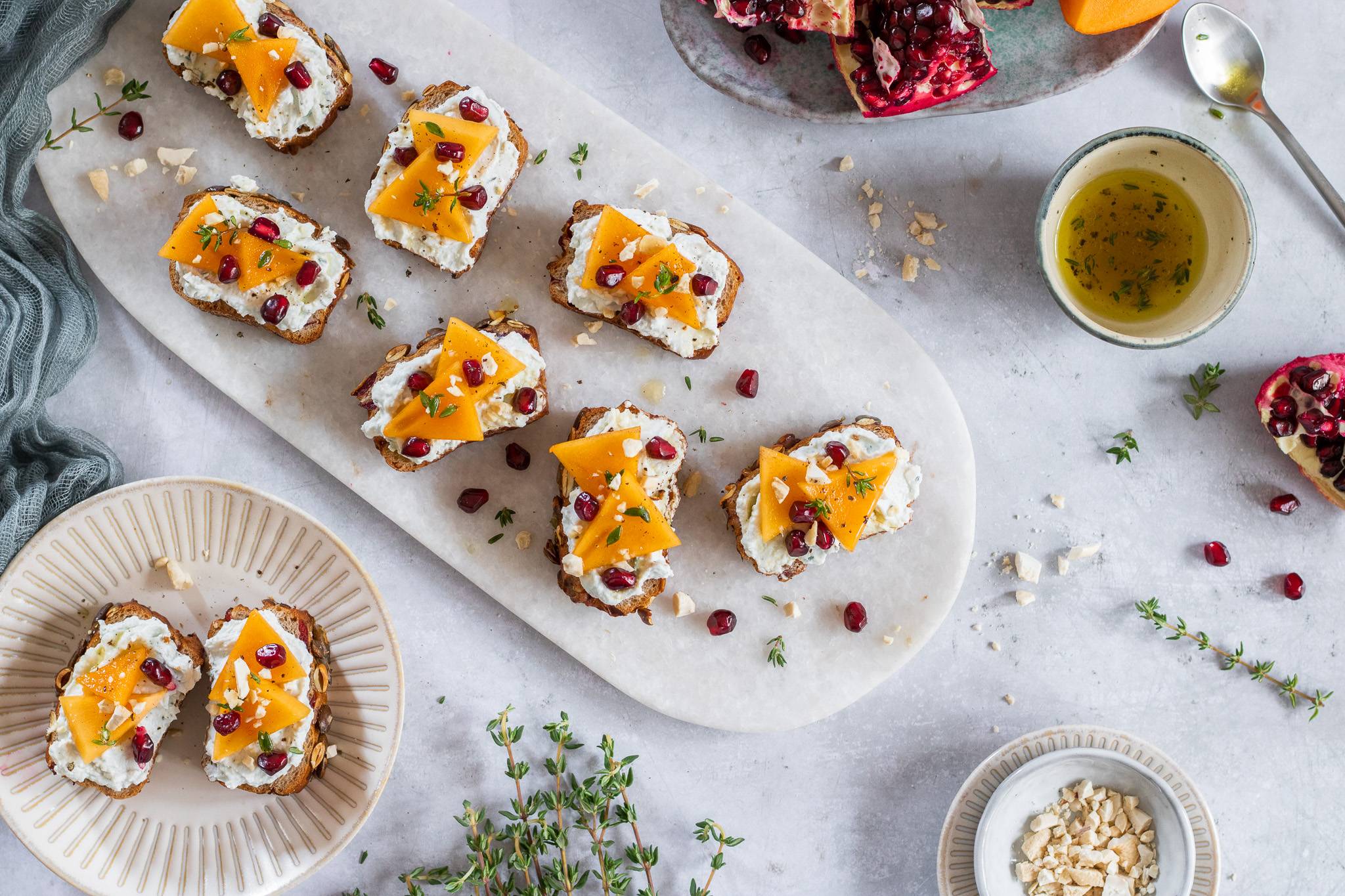 4. Pečivo nakrájejte na plátky. Potřete trochou sýrového krému. Ozdobte pár plátky kaki, posypejte granátovým jablkem a ořechy. Zakápněte zálivkou a lehce opepřete.