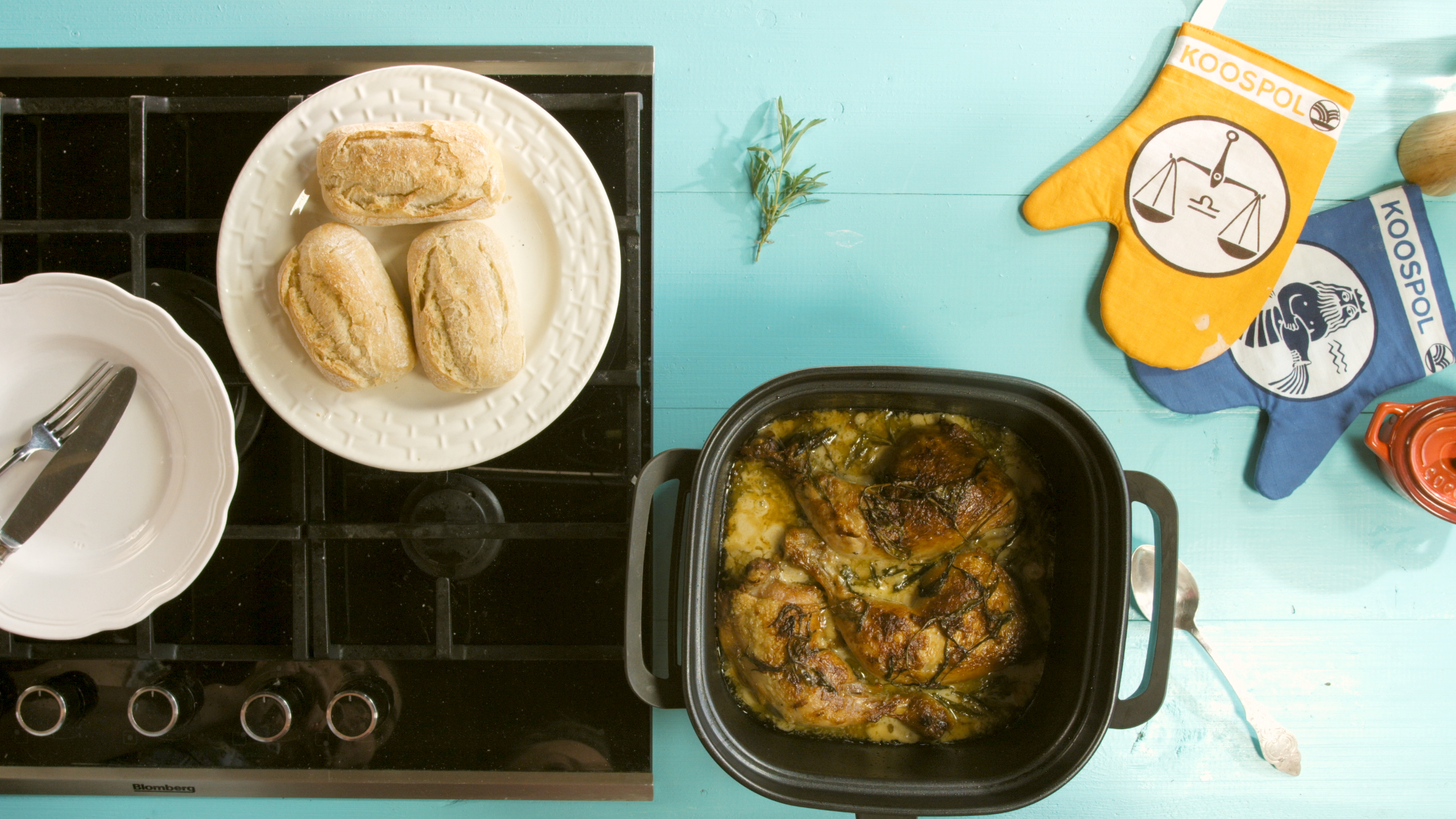 1. V nádobě Pečenky nebo v pánvi rozehřejte olej. Kuřecí stehna osolte, opepřete a zprudka opečte ze všech stran dozlatova, zhruba 5 minut. Vyjměte, na přípečky vlijte víno, promíchejte, nechte zlehka odpařit, vraťte kuře, přidejte pelyněk a přiklopte. Pečte doměkka, zhruba 30 minut.