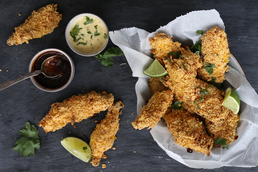 - Nugetky podávejte s dipem z jogurtu, česneku, limetkové kůry a petrželky, který si připravíte jednoduše pomocí tyčového mixéru.
