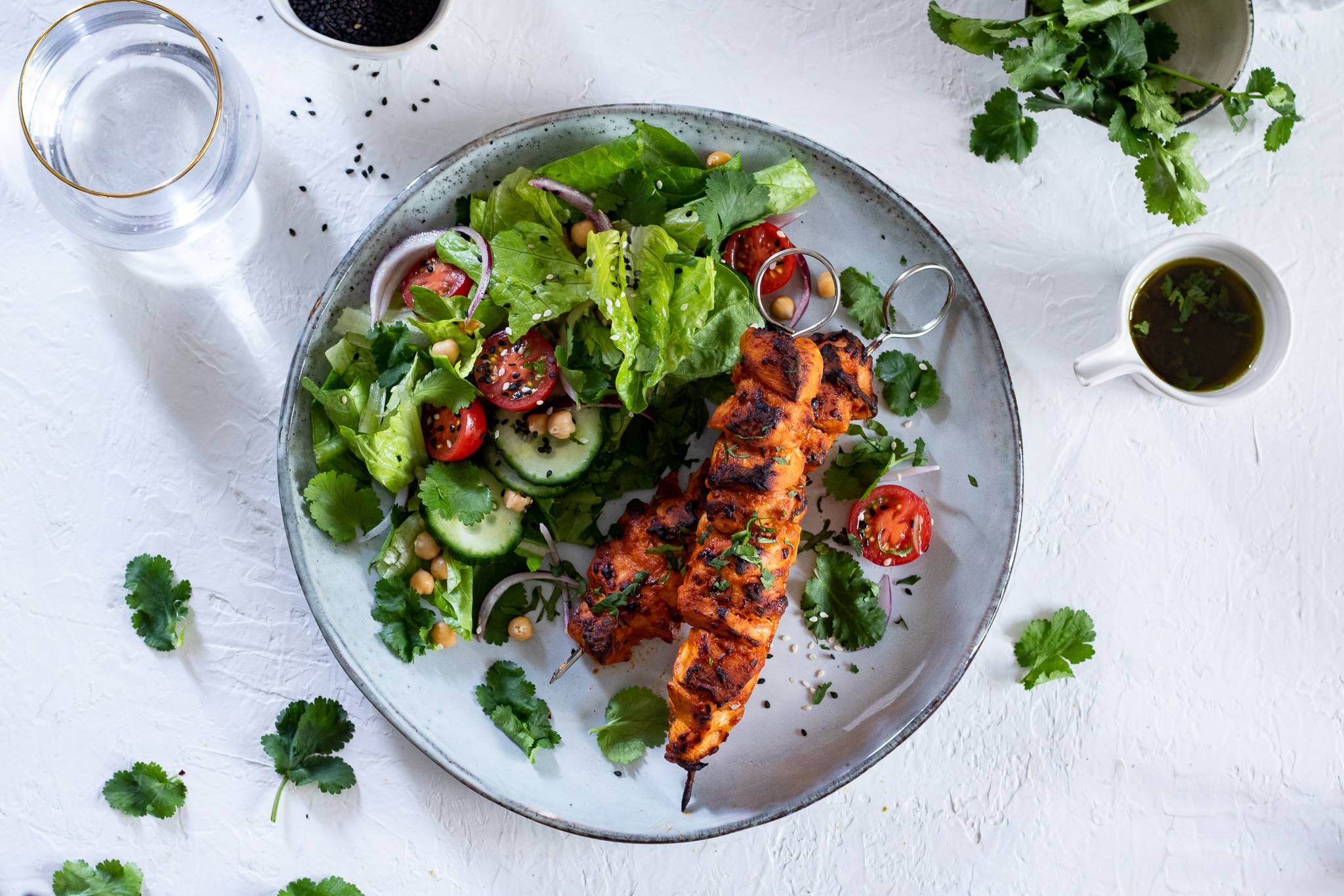 Kuřecí špízy v jogurtové marinádě se salátem s cizrnou