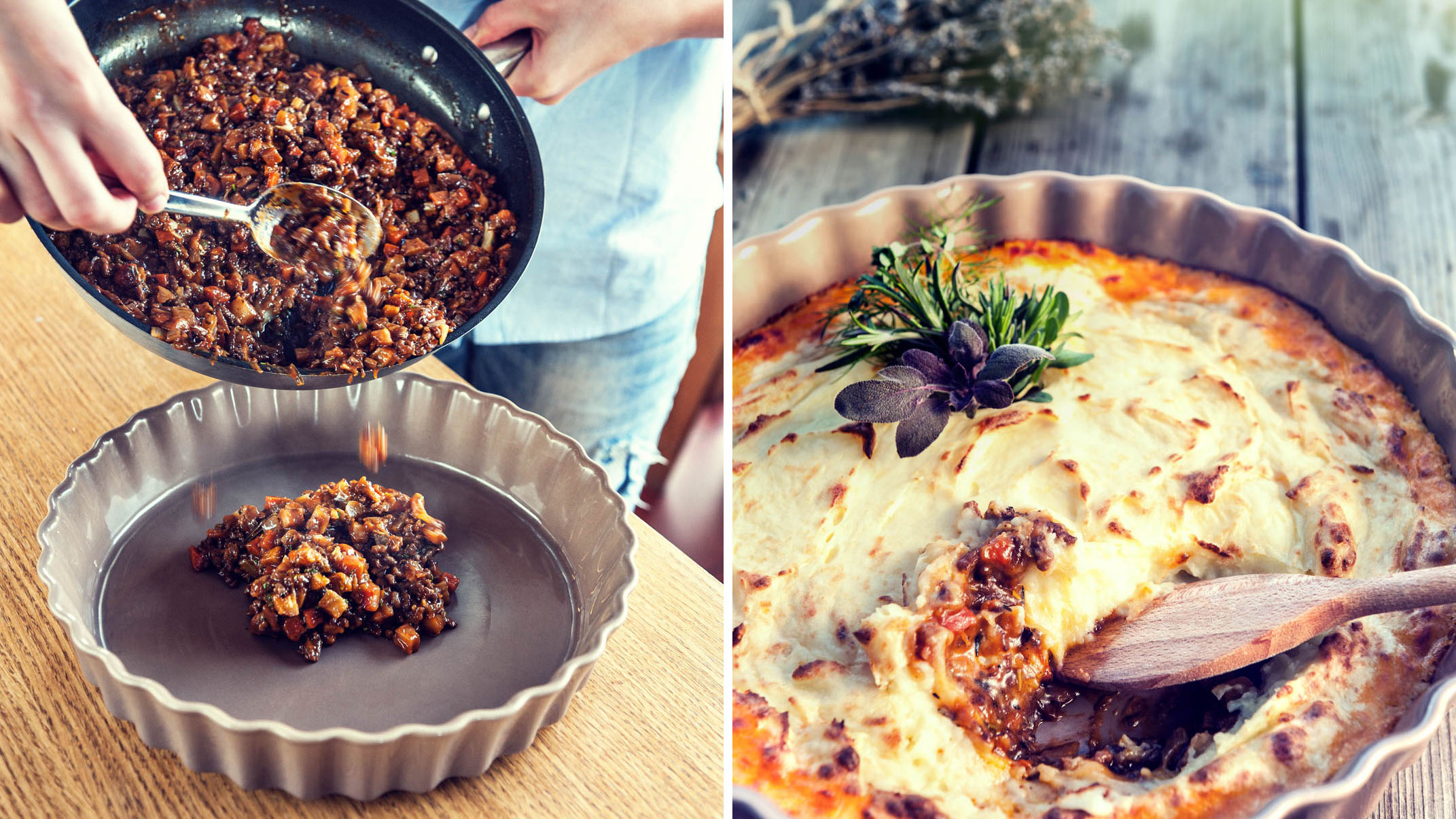 Oblíbený koláč nejen pro milovníky masa. Recept pochází z Anglie, kde je mleté maso se zeleninou zapečené pod vrstvou brambor známé jako pastýřský koláč. Díky bramborové „přikrývce“ zůstane maso krásně šťavnaté a koláč výborně chutná i studený. Perfektní jídlo na horskou salaš i na zimní večírek nebo letní piknik.