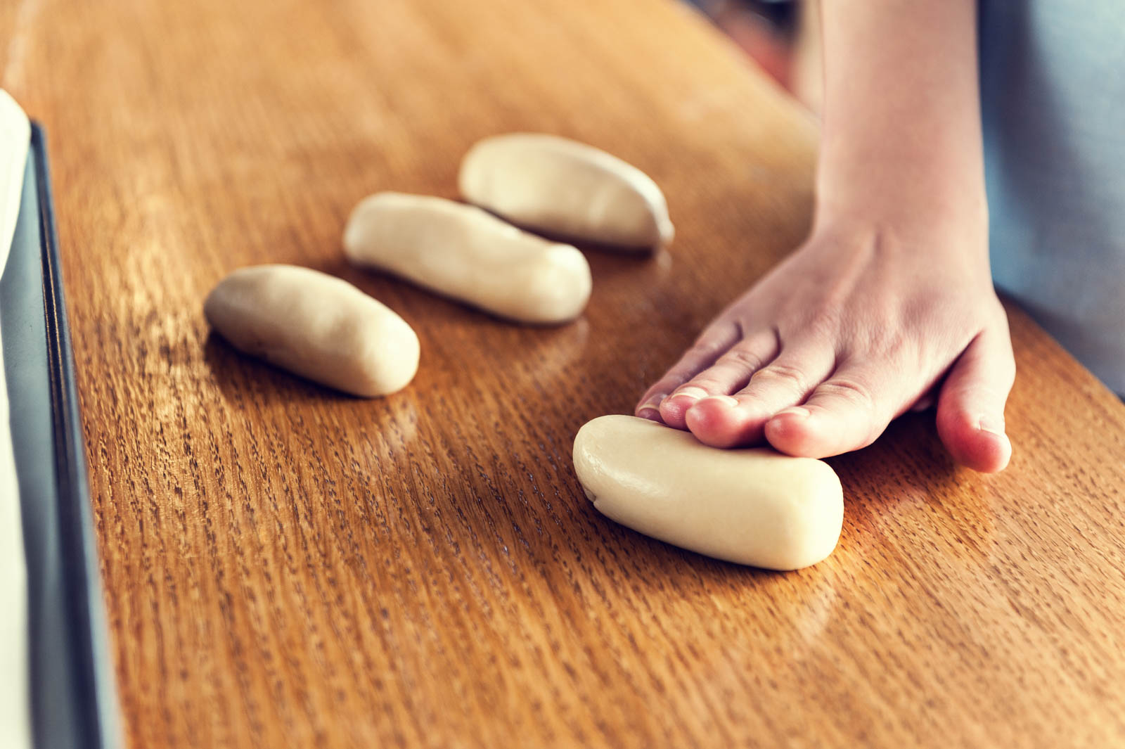 3. Troubu předehřejte na 200 °C. Těsto vyklopte na pomoučenou pracovní desku. Rozdělte ho na 20 stejně velkých kousků, každý rozdělte na tři části, rozválejte na pruhy a spleťte z nich cop. Můžete je na povrchu dvakrát naříznout ostrým nožem jako ozdobu.