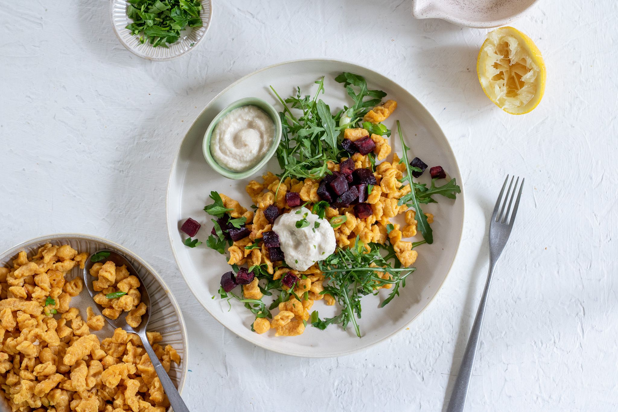 Mrkvové halušky s pečenou řepou a (ne)sýrovou omáčkou z tofu a kešu