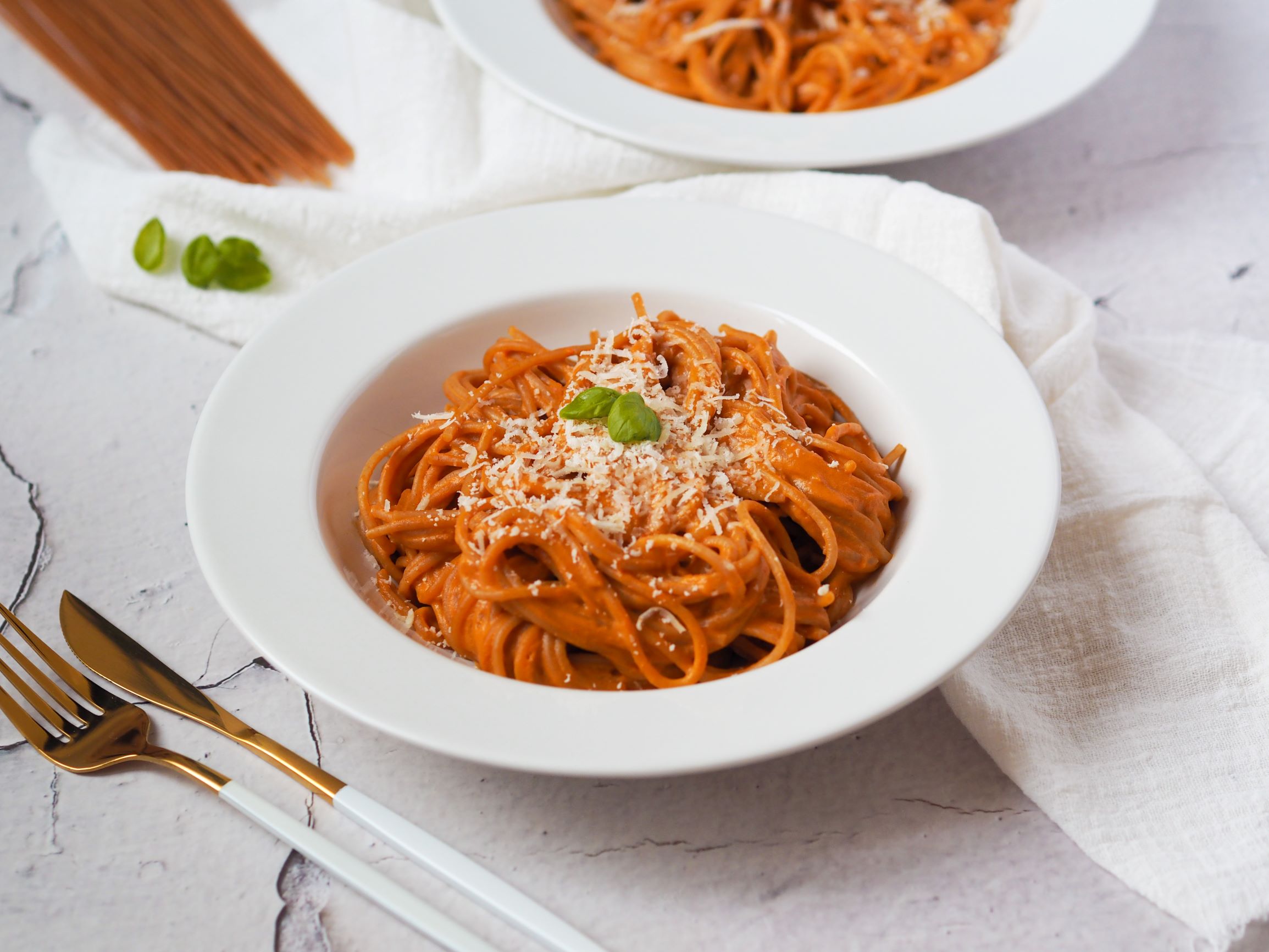 Tento recept od Hungry Panda si jistě zamilujete. Chuť pečených paprik je naprosto jedinečná a díky smetaně získává lahodnou krémovou konzistenci. Bazalka dodá omáčce svěžest a česnek jemnou pikantnost. Celozrnné těstoviny, bohaté na vitaminy, minerály a vlákninu, můžete zvolit podle nálady, zde se fantazii meze nekladou. Vybírat můžete ze špaget, fusilli, penne nebo třeba farfalle.