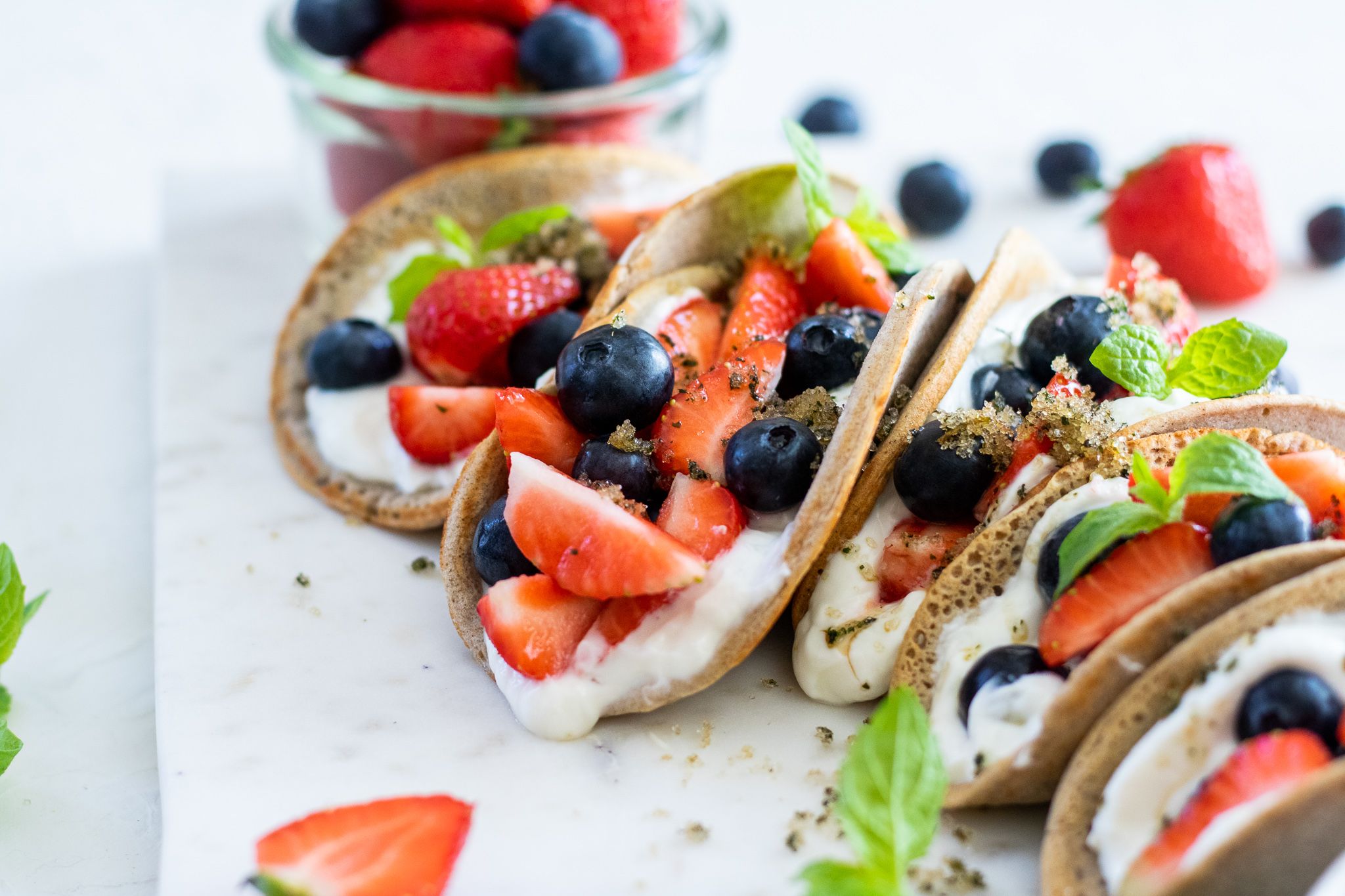 6. Palačinky lehce potřete javorovým sirupem na vnitřní straně. Potřete krémem, posypejte ovocem a mátovým necukrem – xylitolem. Ihned servírujte.