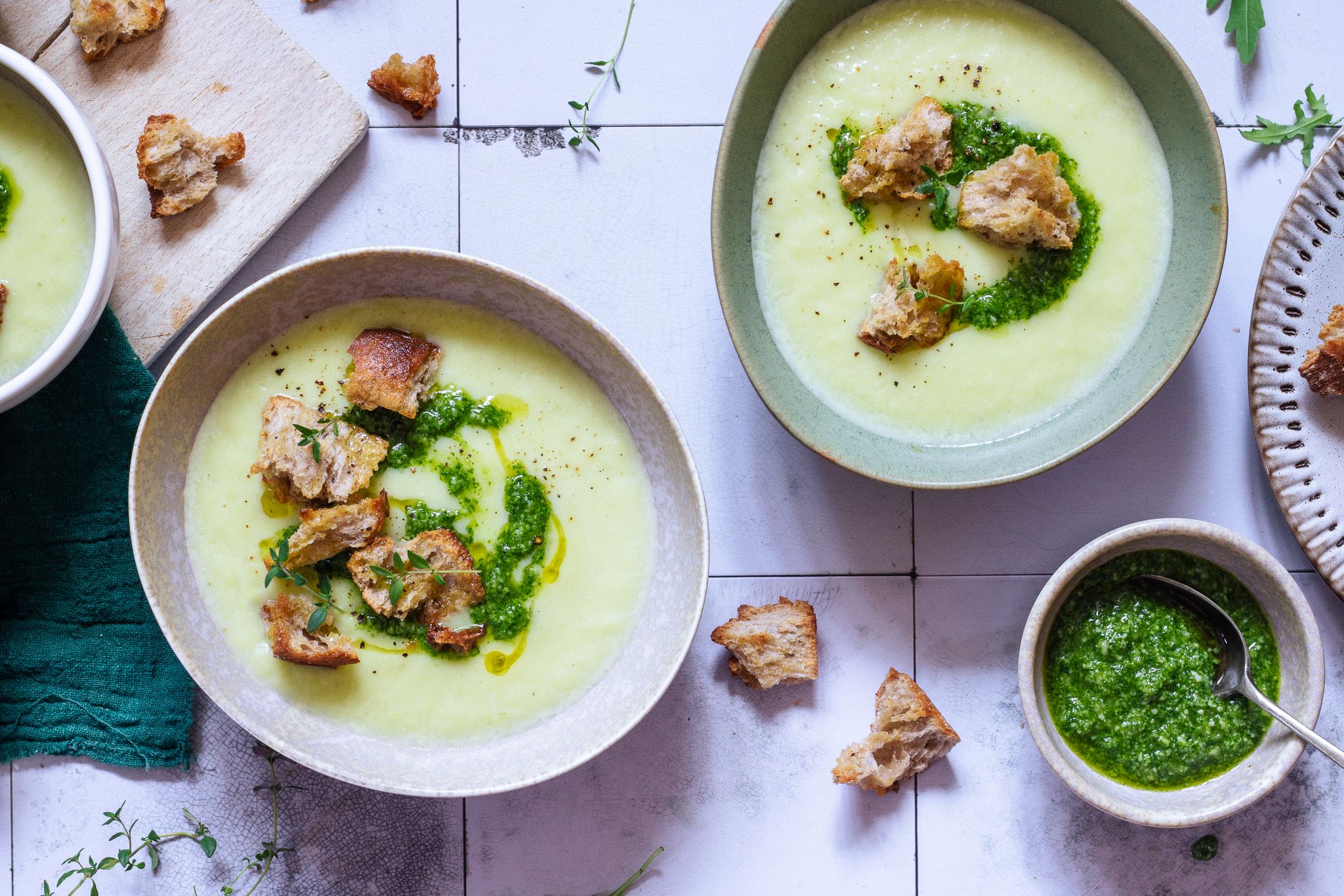 8. Polévku naservírujte do talířů nebo misek. Pokapejte podle chuti pestem, posypejte krutony a opepřete.