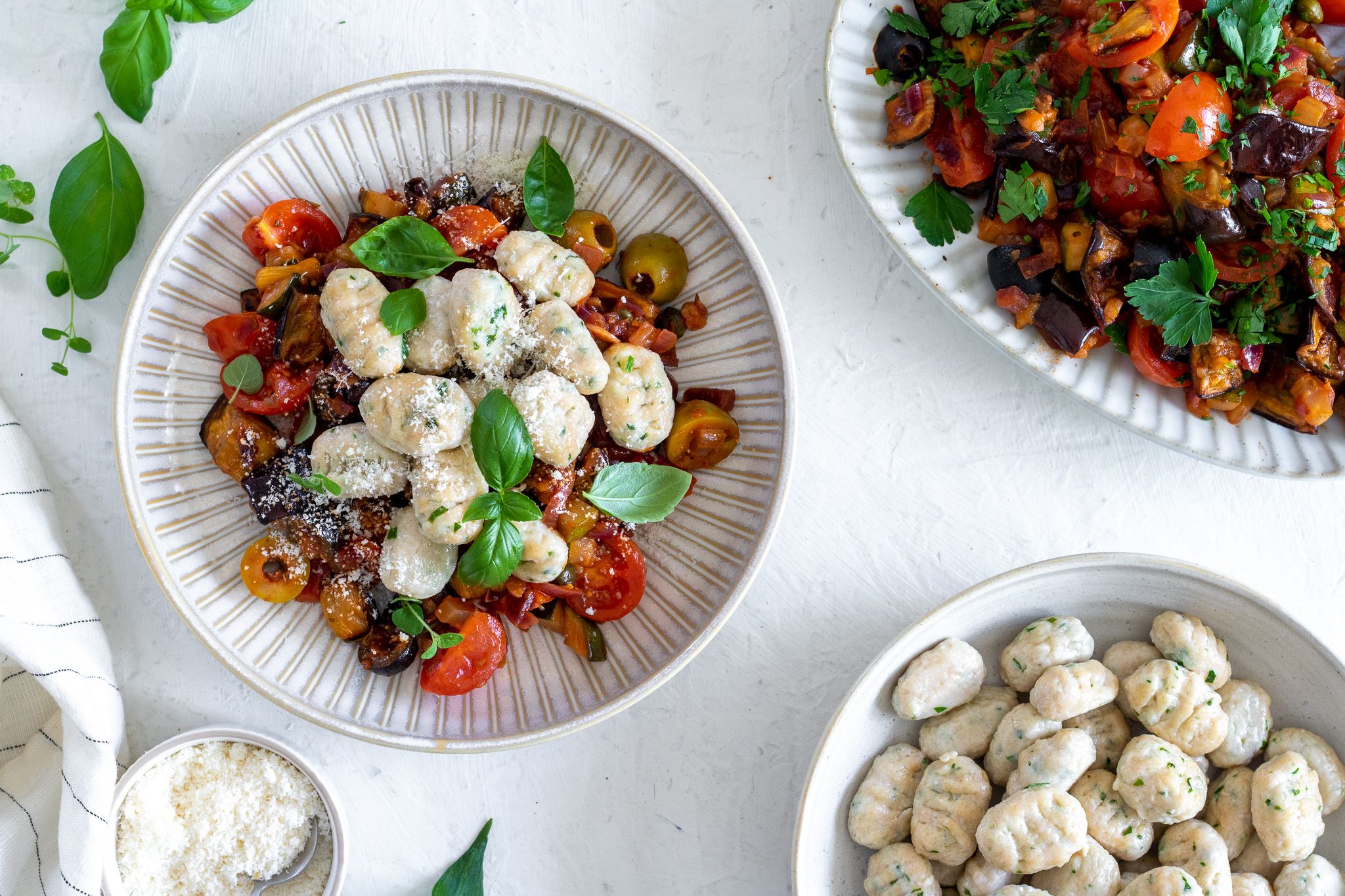Itálie každým coulem. Lahodné ricottové noky jemně dochucené parmezánem a medvědím česnekem doprovází vynikající zeleninová směs zvaná caponata. Sicilská caponata se recept od receptu jemně liší. Lilek se například připravuje rovnou v hrnci se zeleninou. Pokud jej ale upečete zvlášť, nebude se vám rozpadat a ze směsi se nestane kaše. Krom toho spotřebujete i méně oleje. Další proměnnou v receptu jsou například rozinky. Někdo je má ve směsi rád, my dáváme přednost čistě zeleninové verzi.